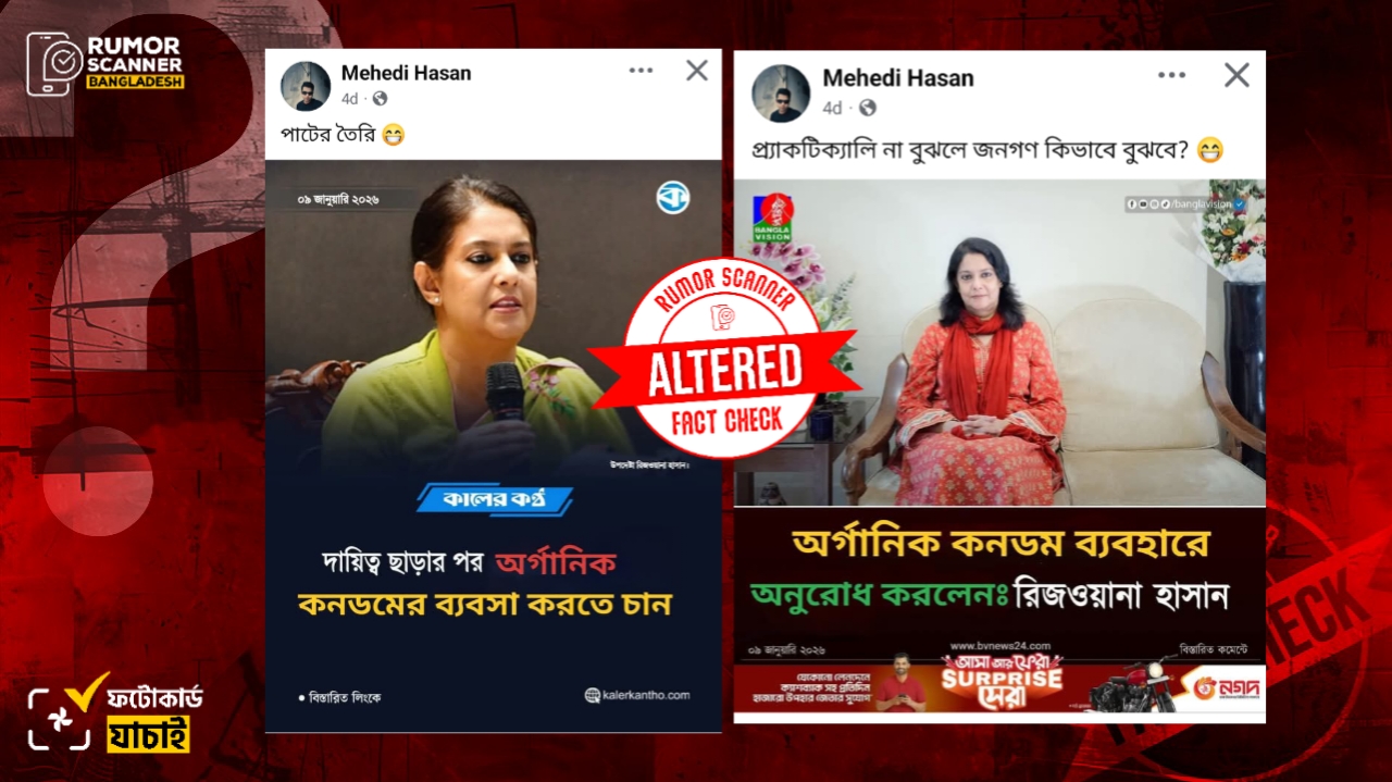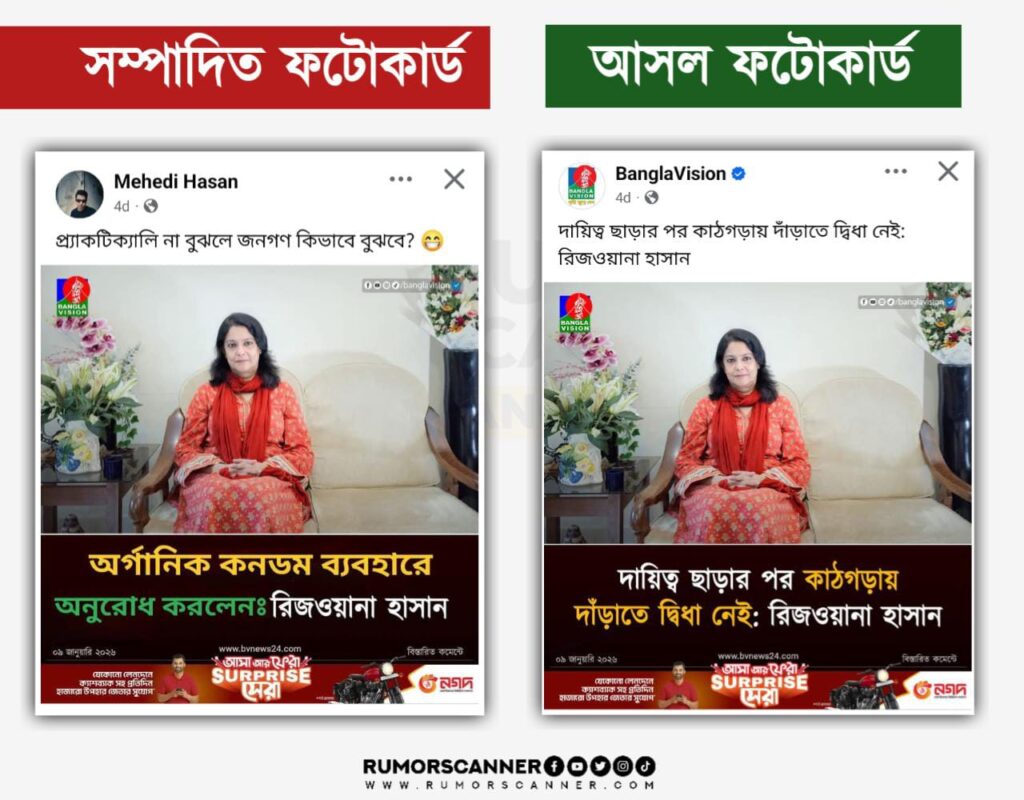 বাংলাভিশন এর নামে প্রচারিত ফটোকার্ডে দাবি করা হয়েছে, ‘অর্গানিক কনডম ব্যবহারে অনুরোধ করলেনঃ রিজওয়ানা হাসান’।