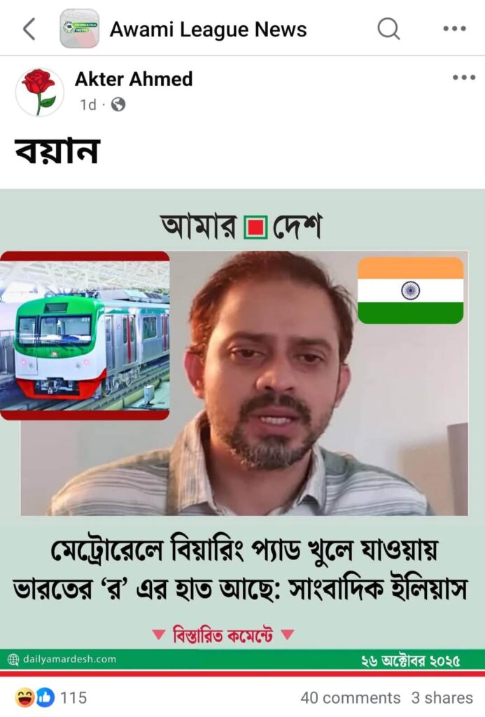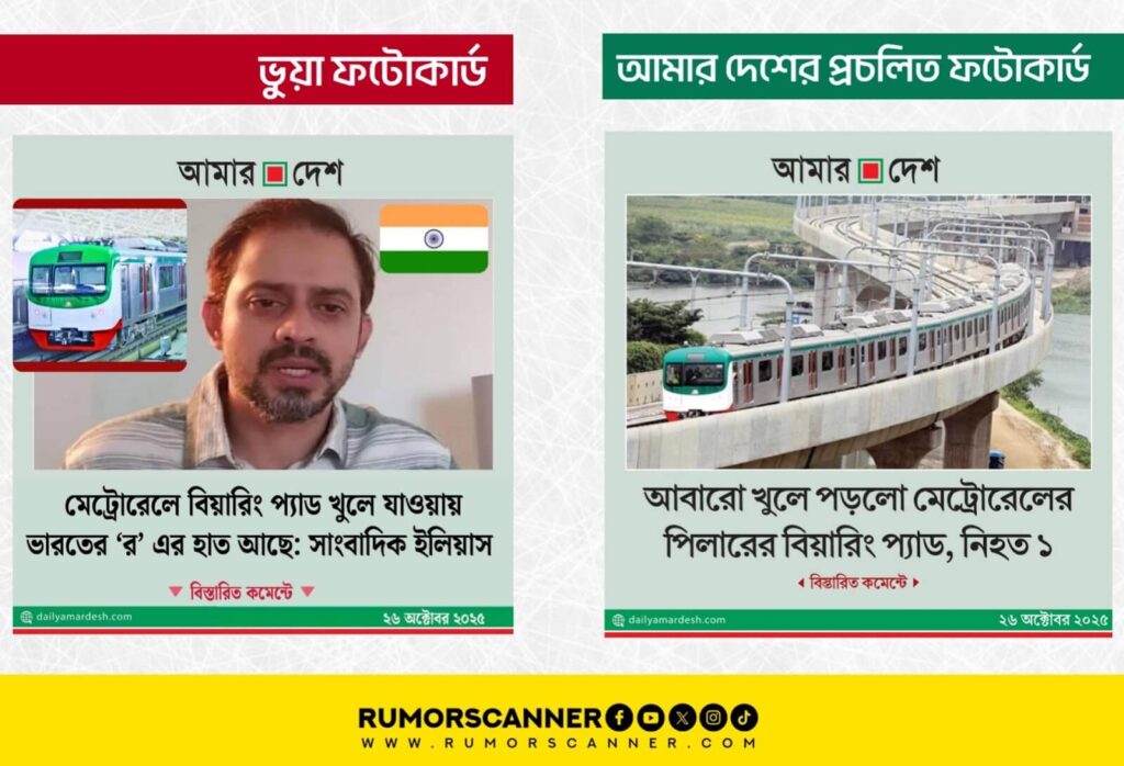 মেট্রোরেলে বিয়ারিং প্যাড খুলে পড়া ইস্যুতে সাংবাদিক ইলিয়াসকে উদ্ধৃত করে আমার দেশের নামে ভুয়া ফটোকার্ড প্রচার
