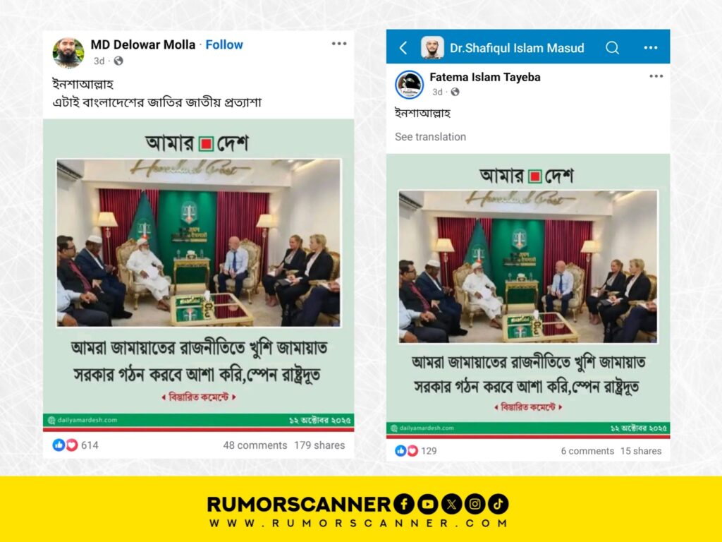 অর্থাৎ, দাবি প্রচার করা হয়েছে, স্পেনের রাষ্ট্রদূত বলেছেন, ‘আমরা জামায়াতের রাজনীতিতে খুশি জামায়াত সরকার গঠন করবে আশা করি’।