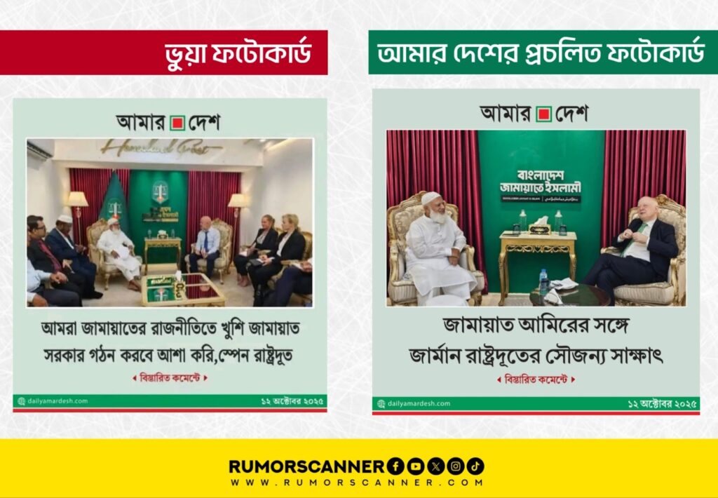 উক্ত সূত্র ধরে সংবাদমাধ্যমটির ফেসবুক পেজ পর্যবেক্ষণ করে আমার দেশের ফেসবুক পেজে গত ১২ অক্টোবর স্পেনের রাষ্ট্রদূতের বক্তব্য সংবলিত এমন কোনো ফটোকার্ড পাওয়া যায়নি। এছাড়া, সংবাদমাধ্যমটির ওয়েবসাইট এবং ইউটিউব চ্যানেলেও উক্ত দাবির বিষয়ে কোনো সংবাদ খুঁজে পাওয়া যায়নি। তবে গত ২৮ সেপ্টেম্বর গণমাধ্যমটির ফেসবুক পেজে ‘ক্ষমতায় গেলে শিক্ষাসহ তিন বিষয়ে গুরুত্ব দেবে জামায়াত’ শিরোনামে প্রকাশিত একটি ফটোকার্ডে ব্যবহৃত ছবির সাথে আলোচিত দাবিতে প্রচারিত ফটোকার্ডে ব্যবহৃত ছবির হুবহু মিল রয়েছে।
