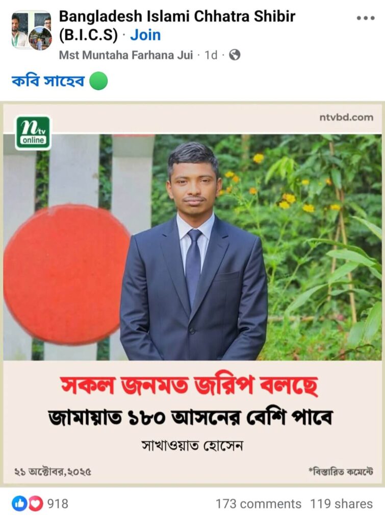 সুতরাং, সাখাওয়াত হোসেন নামক যুবককে উদ্ধৃত করে ‘সকল জনমত জরিপ বলছে জামায়াত ১৮০ আসনের বেশি পাবে’ শিরোনামে এনটিভির নামে প্রচারিত ফটোকার্ডটি ভুয়া ও বানোয়াট।