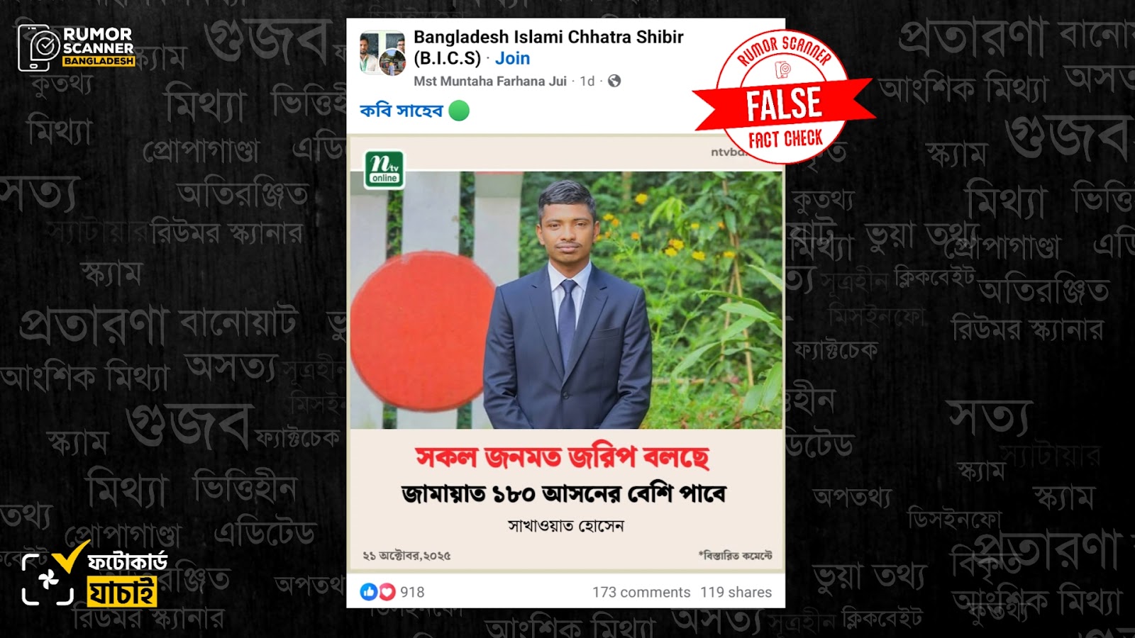 রিউমর স্ক্যানার টিমের অনুসন্ধানে দেখা যায়, ‘সকল জনমত জরিপ বলছে জামায়াত ১৮০ আসনের বেশি পাবে’ শিরোনামে সাখাওয়াত হোসেন নামক যুবককে উদ্ধৃত করে এনটিভি কোনো প্রতিবেদন বা ফটোকার্ড প্রকাশ করেনি। প্রকৃতপক্ষে, এনটিভির ফেসবুক পেজে প্রচারিত ফটোকার্ডের ডিজাইন প্রযুক্তির সহায়তায় নকল করে আলোচিত ফটোকার্ডটি তৈরি করা হয়েছে।