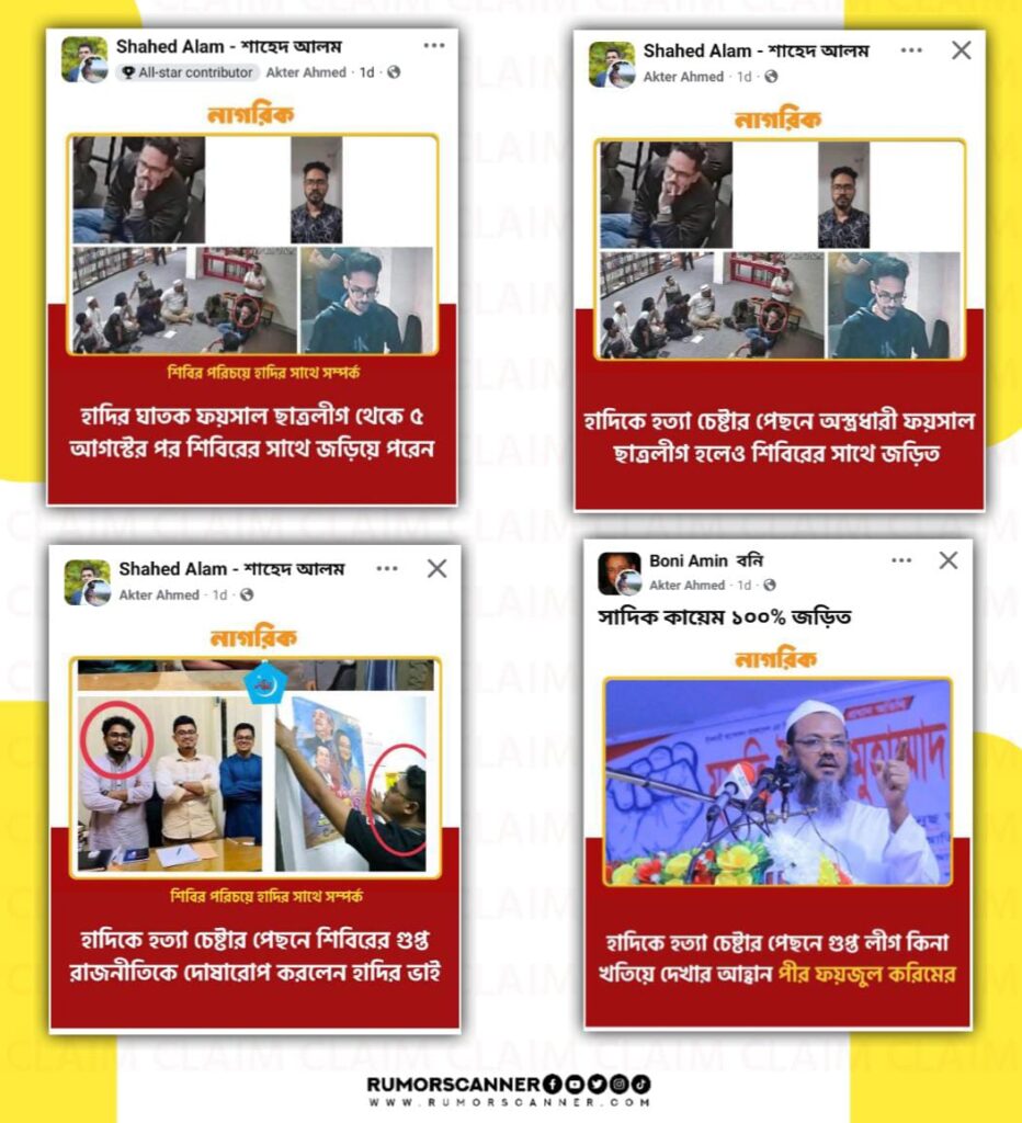 একটি ফটোকার্ডের শিরোনামে দাবি করা হয়- ‘শিবির পরিচয়ে হাদির সাথে সম্পর্ক | হাদির ঘাতক ফয়সাল ছাত্রলীগ থেকে ৫ আগস্টের পর শিবিরের সাথে জড়িয়ে পরেন’।