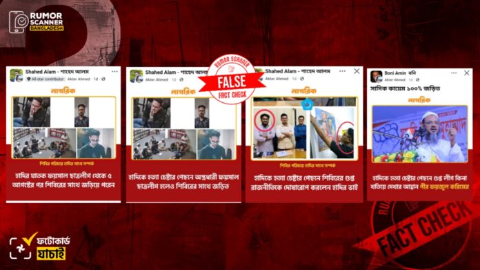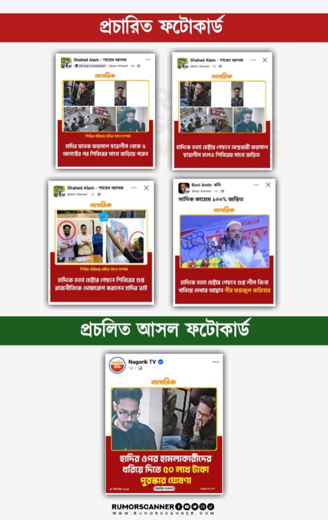 অপর ফটোকার্ডে দাবি করা হয়, ‘শিবির পরিচয়ে হাদির সাথে সম্পর্ক | হাদিকে হত্যা চেষ্টার পেছনে শিবিরের গুপ্ত রাজনীতিকে দোষারোপ করলেন হাদির ভাই’।