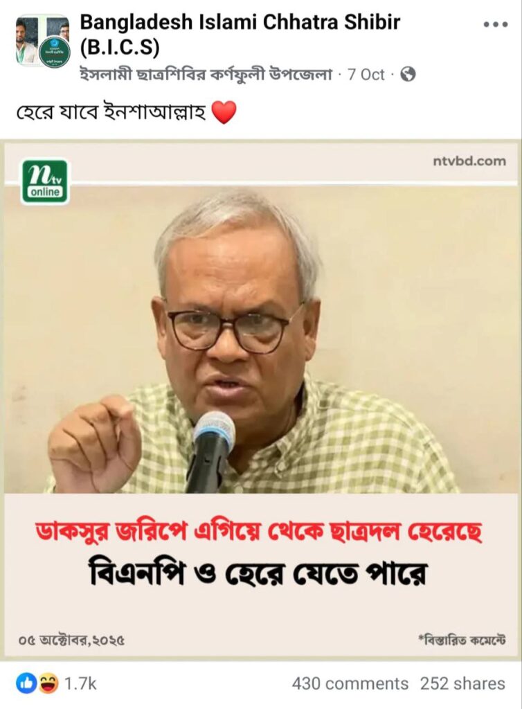 এনটিভির লোগো ও ডিজাইন ছবি সংবলিত একটি ফটোকার্ডে দাবি করা হয়- রুহুল কবির রিজভী বলেছেন, ‘ডাকসুর জরিপে এগিয়ে থেকে ছাত্রদল হেরেছে, বিএনপি ও হেরে যেতে পারে’।