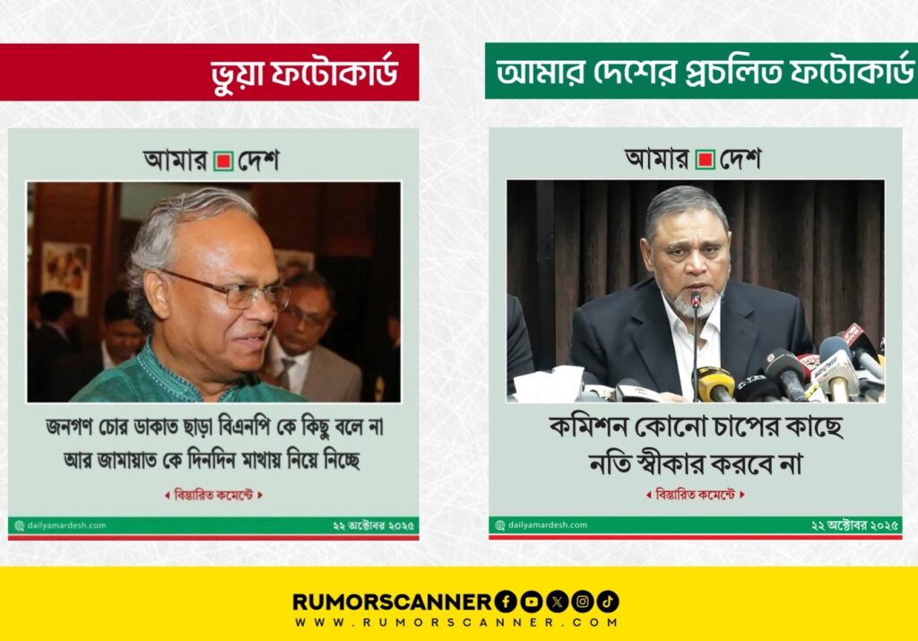 রিউমর স্ক্যানার টিমের অনুসন্ধানে জানা যায়, ফটোকার্ডগুলোতে উল্লিখিত মন্তব্যগুলো রুহুল কবির রিজভী করেননি। আমার দেশ এবং এনটিভিও এরূপ কোনো ফটোকার্ড প্রকাশ করেনি। প্রকৃতপক্ষে, ডিজিটাল প্রযুক্তির সহায়তায় গণমাধ্যম দুটির ডিজাইনের আদলে ফটোকার্ড তৈরি করে ভুয়া এই দাবিগুলো প্রচার করা হয়েছে।