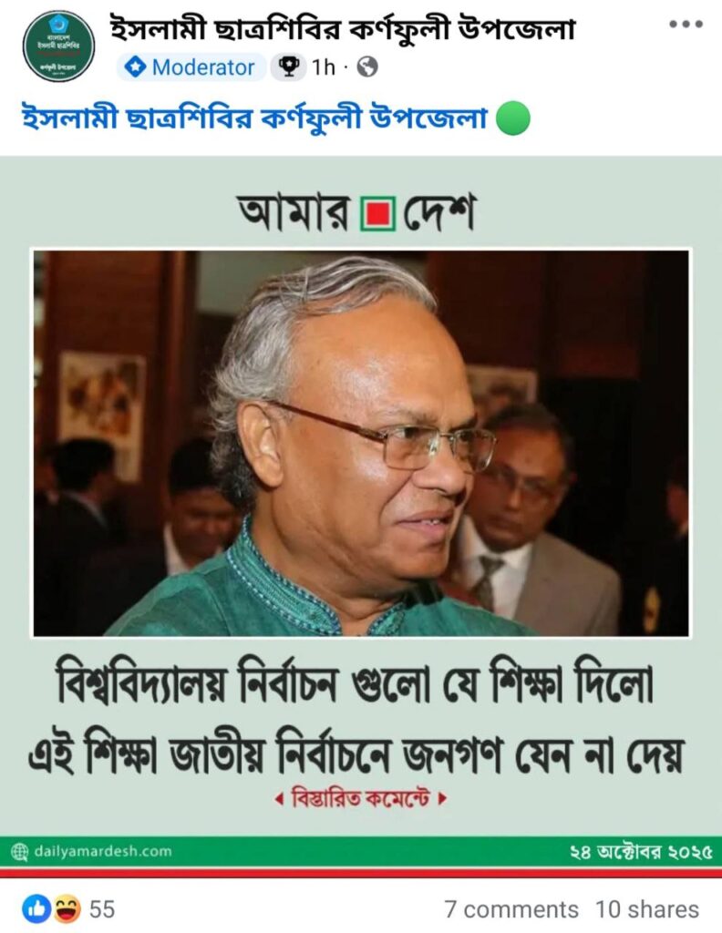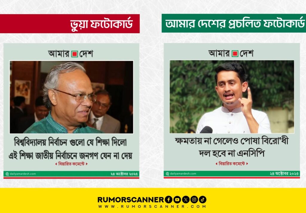 আমার দেশ এর লোগো ও ডিজাইন সংবলিত আরেকটি ফটোকার্ডে দাবি করা হয়- রুহুল কবির রিজভী বলেছেন, ‘বিশ্ববিদ্যালয় নির্বাচন গুলো যে শিক্ষা দিলো এই শিক্ষা জাতীয় নির্বাচনে জনগণ যেন না দেয়’।