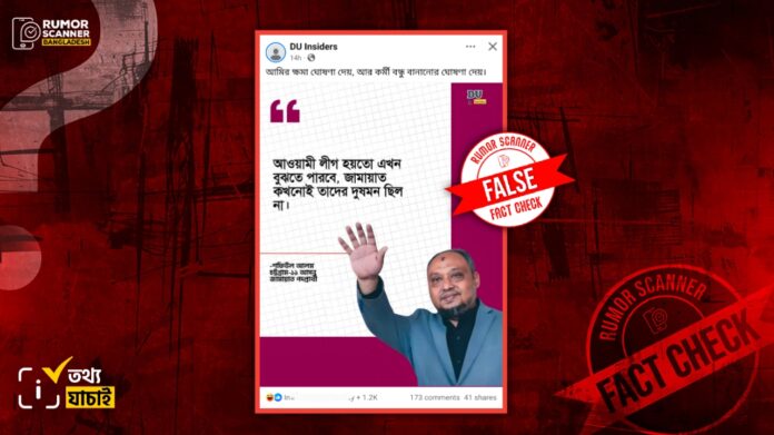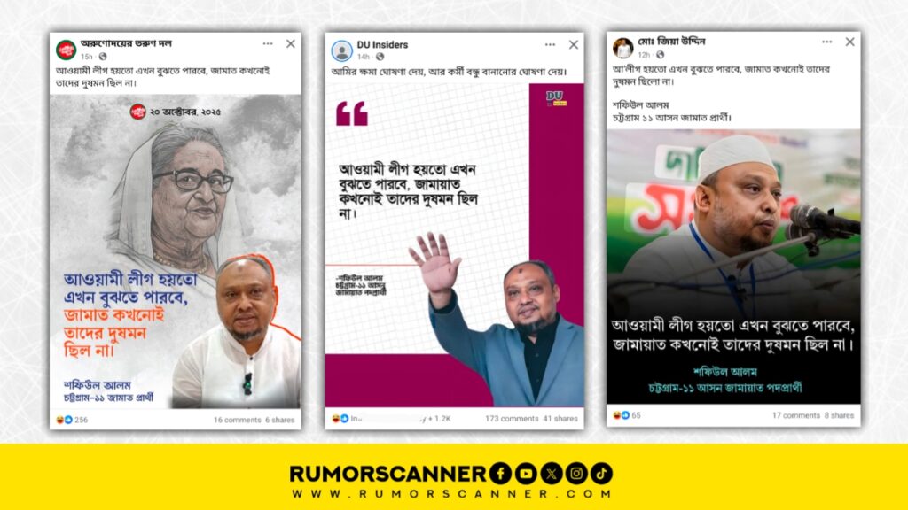 সুতরাং, জামায়াতে ইসলামীর নেতা মোহাম্মদ শফিউল আলম ‘আওয়ামী লীগ হয়তো এখন বুঝতে পারবে, জামায়াত কখনোই তাদের দুষমন ছিল না’ শীর্ষক মন্তব্য করেছেন দাবিতে প্রচারিত তথ্যটি সম্পূর্ণ মিথ্যা।