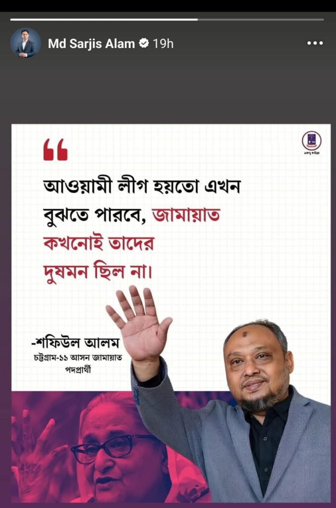 একই দাবিতে ফেসবুকে স্টোরি দিয়েছেন জাতীয় নাগরিক পার্টির নেতা সারজিস আলম।