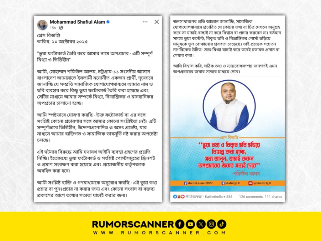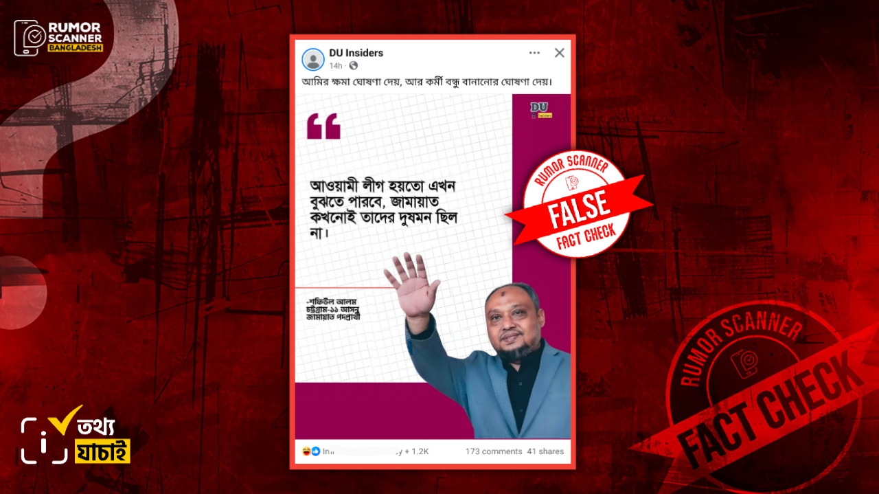 রিউমর স্ক্যানার টিমের অনুসন্ধানে দেখা যায়, জামায়াত নেতা মোহাম্মদ শফিউল আলম উক্ত মন্তব্য করেননি। প্রকৃতপক্ষে, সম্পূর্ণ ভিত্তিহীনভাবে তার নাম ব্যবহার করে আলোচিত দাবিটি প্রচার করা হয়েছে।