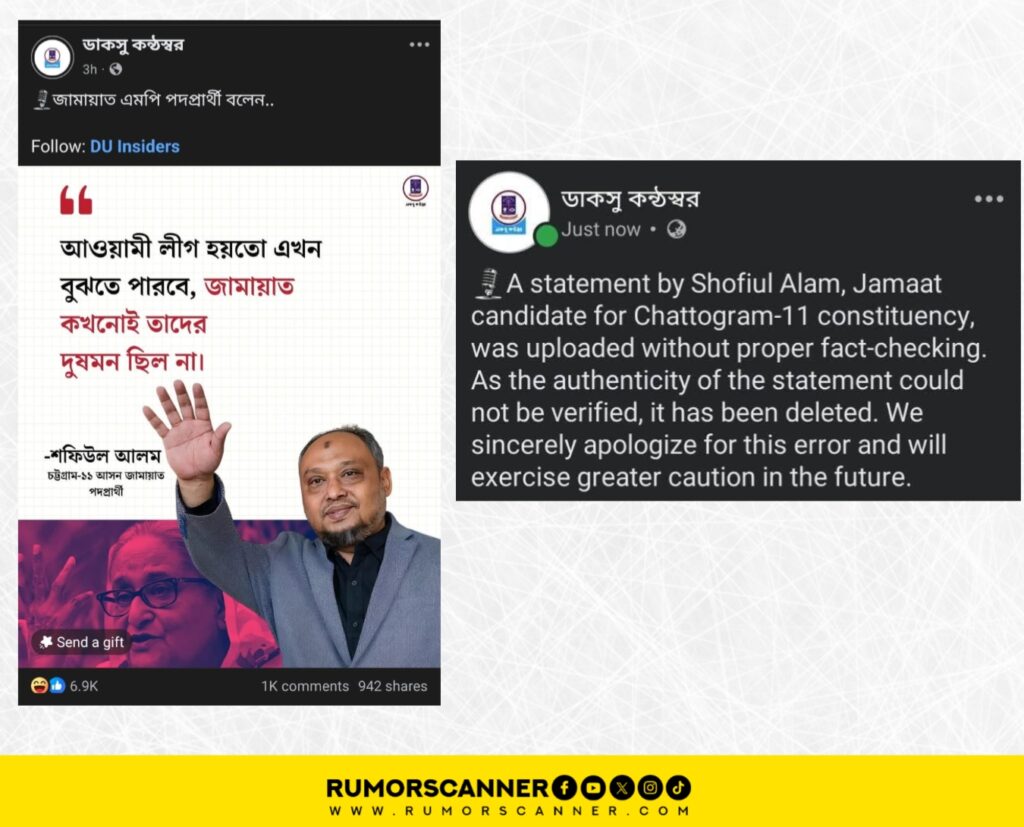 পরবর্তীতে তার অ্যাকাউন্টে আরেকটি পোস্ট খুঁজে পাওয়া যায়। যেখানে তিনি উল্লেখ করেন, ডাকসু কণ্ঠস্বর নামের একটি ফেসবুক পেজও কোনো প্রকার যাচাই-বাছাই ছাড়াই আলোচিত দাবিতে প্রচারিত ফটোকার্ডটি শেয়ার করে। পরবর্তীতে তারা ভুল বুঝতে পেরে পোস্টটি সরিয়ে নেয় এবং দুঃখ প্রকাশ করে একটি ফেসবুক পোস্টও করেন। মোহাম্মদ শফিউল আলমের করা পোস্টটিতে তিনি সেই পোস্টের একটি স্ক্রিনশটও যুক্ত করে দেন।