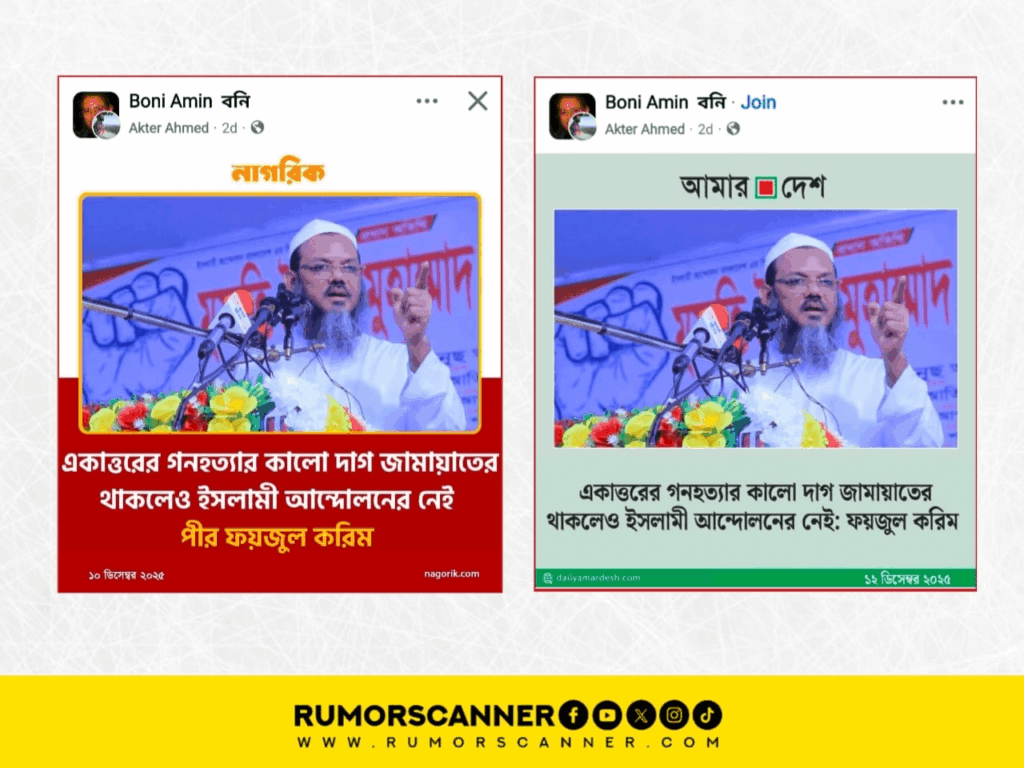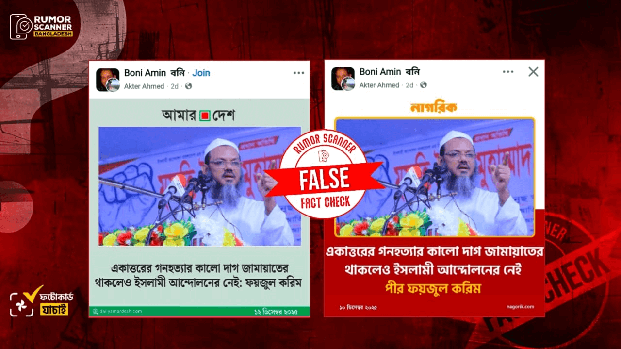 রিউমর স্ক্যানার টিমের অনুসন্ধানে জানা যায়, মুফতি সৈয়দ মুহাম্মদ ফয়জুল করিম “একাত্তরের গনহত্যার কালো দাগ জামায়াতের থাকলেও ইসলামী আন্দোলনের নেই” শীর্ষক কোনো মন্তব্য করেননি এবং উক্ত দাবিতে নাগরিক টিভি ও আমার দেশ কোনো ফটোকার্ড প্রকাশ করেনি। প্রকৃতপক্ষে, নাগরিক টিভি এবং দৈনিক আমার দেশের ফটোকার্ডের ডিজাইন নকল করে মুফতি সৈয়দ মুহাম্মদ ফয়জুল করিমের নামে আলোচিত দাবি সংবলিত ফটোকার্ডগুলো প্রচার করা হয়েছে।
