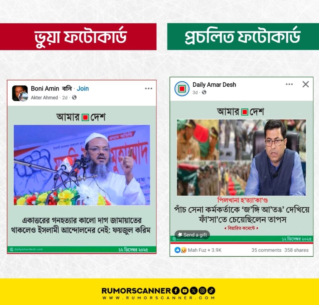 দৈনিক আমার দেশের নামে ‘একাত্তরের গনহত্যার কালো দাগ জামায়াতের থাকলেও ইসলামী আন্দোলনের নেই: ফয়জুল করিম’ শিরোনামে প্রচারিত ফটোকার্ড দেখুন এখানে (আর্কাইভ)।
