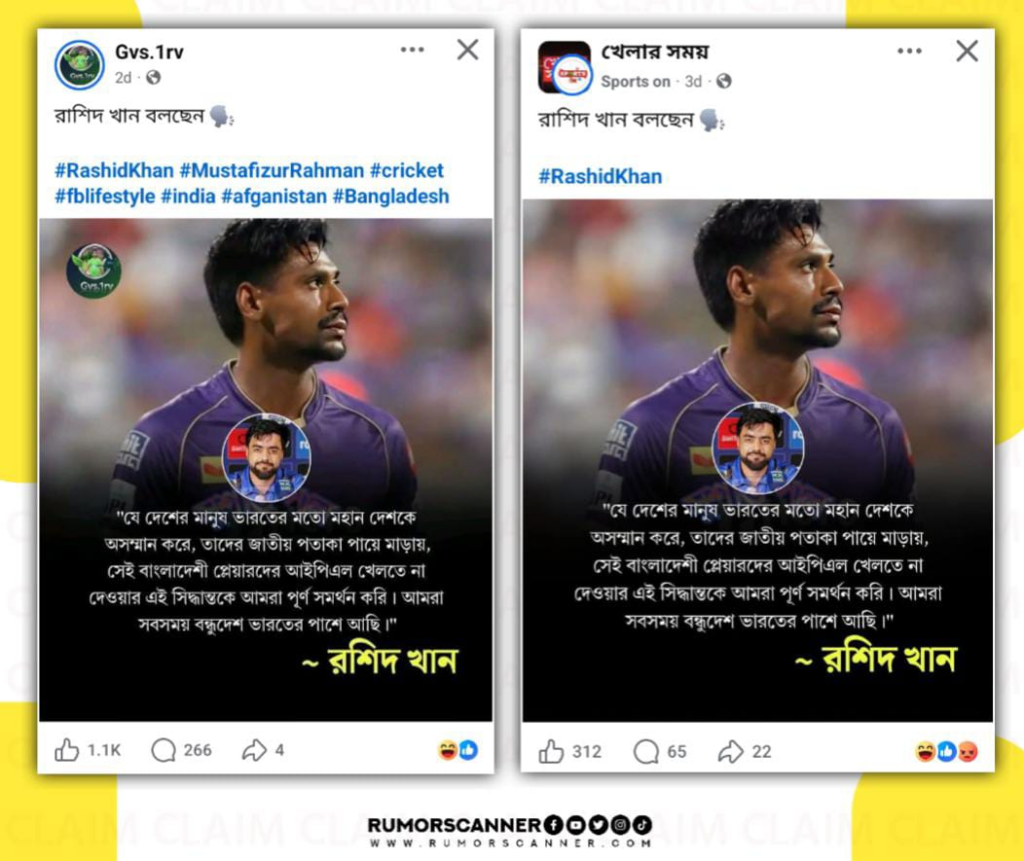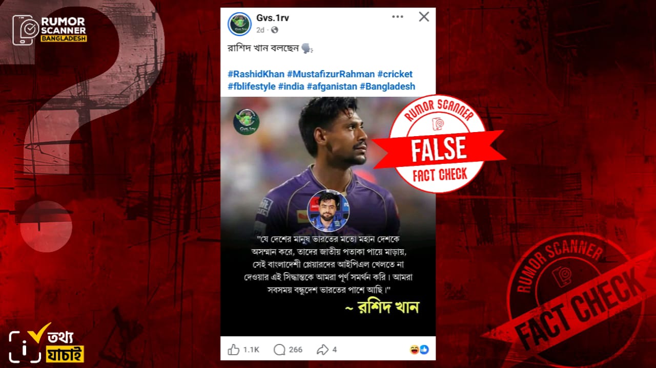 ভারতীয় ক্রিকেট বোর্ডের (বিসিসিআই) নির্দেশে বাংলাদেশের পেসার মোস্তাফিজুর রহমানকে স্কোয়াড থেকে বাদ দিয়েছে আইপিএলের ফ্র্যাঞ্চাইজি দল কলকাতা নাইট রাইডার্স। এরই প্রেক্ষিতে সম্প্রতি অনলাইনে দাবি প্রচার করা হয়েছে আফগান ক্রিকেটার রশিদ খান বলেছেন- “যে দেশের মানুষ ভারতের মতো মহান দেশকে অসম্মান করে, তাদের জাতীয় পতাকা পায়ে মাড়ায়, সেই বাংলাদেশী প্লেয়ারদের আইপিএল খেলতে না দেওয়ার এই সিদ্ধান্তকে আমরা পূর্ণ সমর্থন করি। আমরা সবসময় বন্ধুদেশ ভারতের পাশে আছি”।