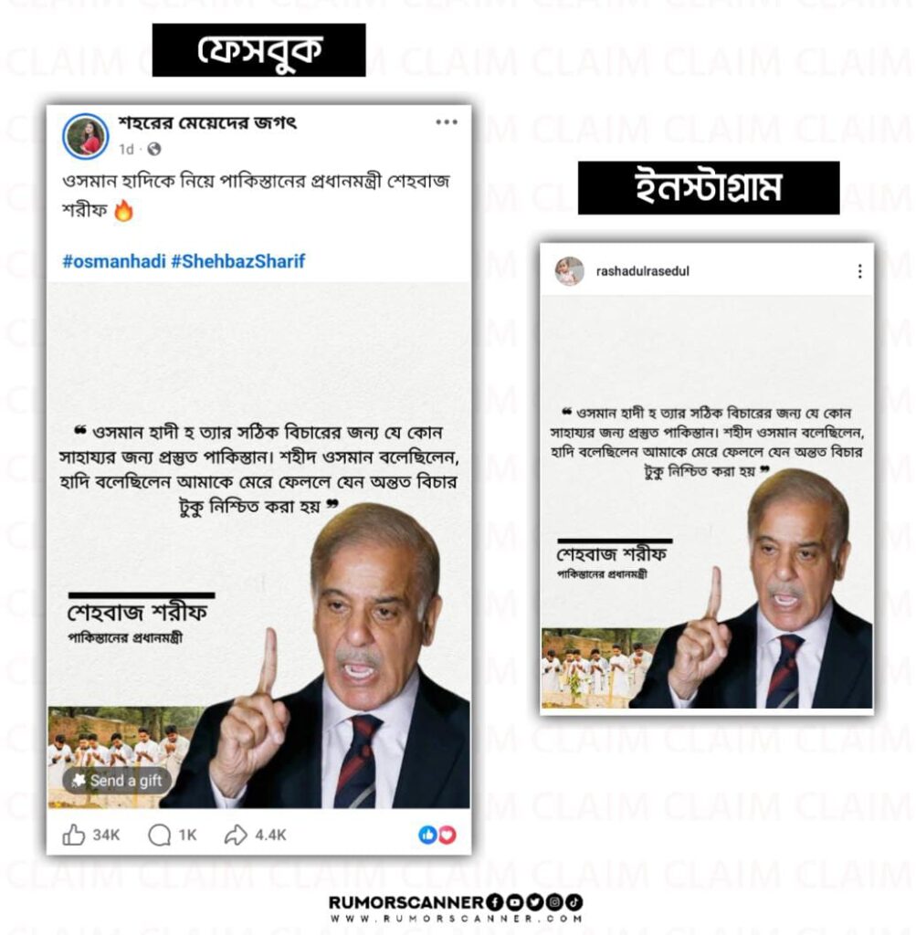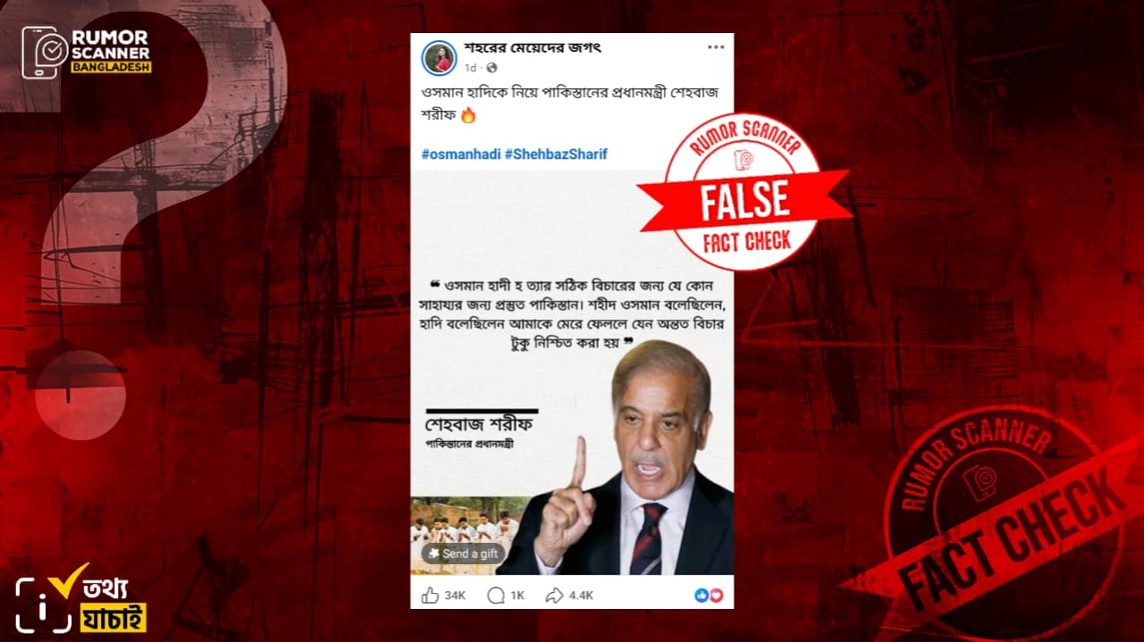 রিউমর স্ক্যানার টিমের অনুসন্ধানে জানা যায়, পাকিস্তানের প্রধানমন্ত্রী শেহবাজ শরীফ ‘ওসমান হাদী হত্যার সঠিক বিচারের জন্য যে কোন সাহায্যর জন্য প্রস্তুত পাকিস্তান’ শীর্ষক মন্তব্যটি করেননি। প্রকৃতপক্ষে, কোনোরকম নির্ভরযোগ্য তথ্যপ্রমাণ ছাড়াই শেহবাজ শরীফের নামে আলোচিত ভুয়া এই মন্তব্যটি প্রচার করা হয়েছে।