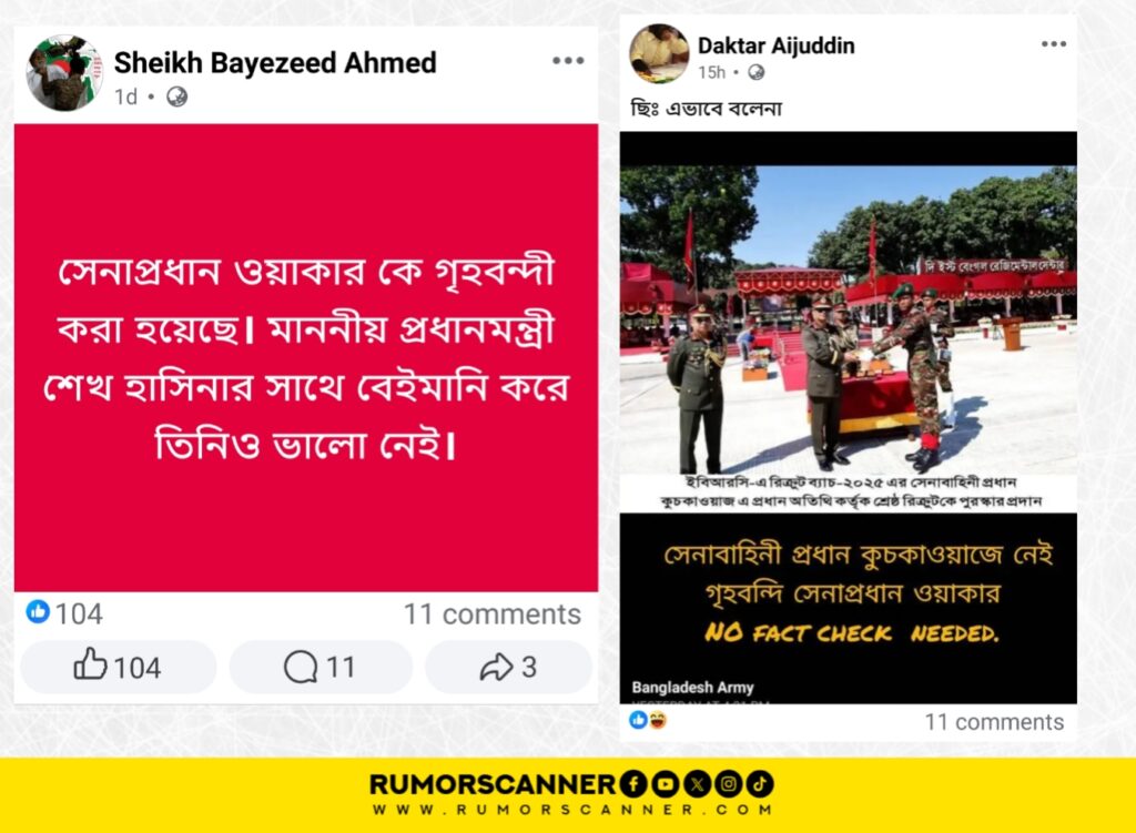 গত ১৫ অক্টোবর চট্টগ্রাম সেনানিবাসস্থ দি ইস্ট বেঙ্গল রেজিমেন্টাল সেন্টারে (ইবিআরসি) বাংলাদেশ সেনাবাহিনীর ইস্ট বেংগল রেজিমেন্টের রিক্রুট ব্যাচ-২০২৫ এর সেনাবাহিনী প্রধান কুচকাওয়াজ অনুষ্ঠিত হয়। এই অনুষ্ঠানের ছবি ব্যবহার করে দাবি করা হচ্ছে, সেনাবাহিনী প্রধান জেনারেল ওয়াকার-উজ-জামান গৃহবন্দী থাকায় এই কুচকাওয়াজে উপস্থিত ছিলেন না।