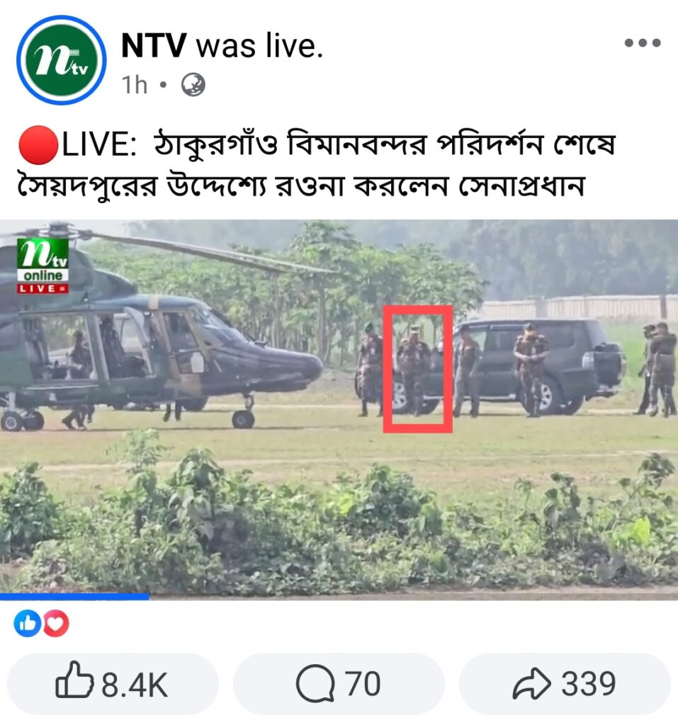 পরবর্তীতে সেনাপ্রধানের গৃহবন্দী থাকার দাবিটির বিষয়ে অনুসন্ধানে জানা যায়, প্রচারিত পোস্টগুলোর পূর্বেই গত ১৪ অক্টোবরের কিছু পোস্ট (এখানে, এখানে) পাওয়া যায়, যেগুলোতে বলা হয়, সেনাপ্রধান বৃহস্পতিবার (১৬ অক্টোবর) ঠাকুরগাঁও বিমানবন্দর পরিদর্শনে যাবেন। সে মোতাবেক কিওয়ার্ড সার্চ করে মূল ধারার গণমাধ্যম এনটিভির ফেসবুক পেজে ১৬ অক্টোবর দুপুরের একটি লাইভ ভিডিও পাওয়া যায়। ভিডিওর বর্ণনা থেকে জানা যায়, সেদিন ঠাকুরগাঁও বিমানবন্দর পরিদর্শনে আসেন সেনাপ্রধান। এরপর তিনি সৈয়দপুরের উদ্দেশ্যে রওনা দেন।
