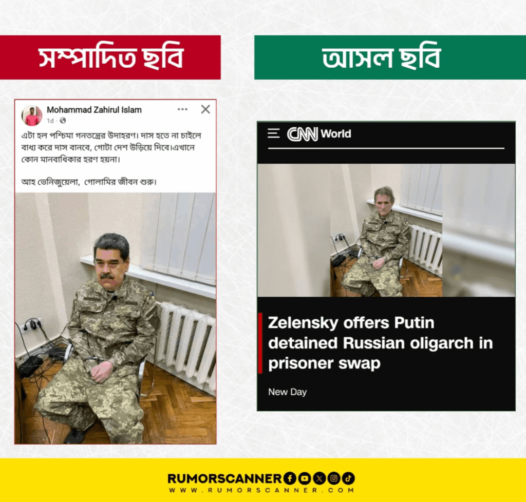 রিউমর স্ক্যানার টিমের অনুসন্ধানে জানা যায়, প্রচারিত ছবিটি নিকোলা মাদুরোর নয়। প্রকৃতপক্ষে, ইউক্রেনের ক্রেমলিন-পন্থী রাজনীতিবিদ ভিক্টর মেদভেদচুকের ছবিতে ডিজিটাল প্রিযুক্তির সহায়তায় মাদুরোর মুখমণ্ডল বসিয়ে আলোচিত দাবি সংবলিত ছবিটি প্রচার করা হয়েছে।