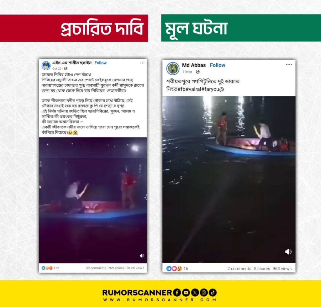রিউমর স্ক্যানার টিমের অনুসন্ধানে দেখা যায়, আলোচিত ভিডিওটি নারায়ণগঞ্জে শিবিরের নেতাকর্মী দ্বারা মাসুদ নামের কথিত কোনো যুবদল নেতার হত্যাকাণ্ডের ঘটনার নয়। প্রকৃতপক্ষে, গত ২৮ ফেব্রুয়ারি দিবাগত রাতে শরীয়তপুরের কীর্তিনাশা নদীর তীরে ডাকাতি করে পালিয়ে যাওয়ার সময় ডাকাত দলকে ধরে গণধোলাই দেয় স্থানীয় লোকজন। উক্ত ঘটনার ভিডিও এটি।