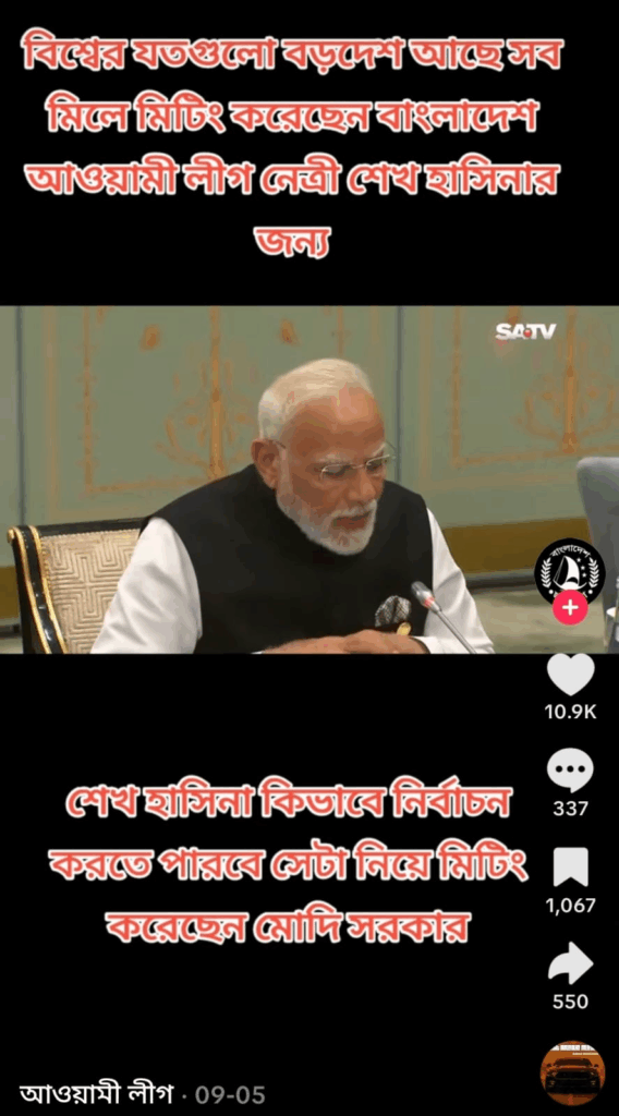 সম্প্রতি, “বিশ্বের যতগুলো বড়দেশ আছে সব মিলে মিটিং করেছেন বাংলাদেশ আওয়ামী লীগ নেত্রী শেখ হাসিনার জন্য” এবং “শেখ হাসিনা কিভাবে নির্বাচন করতে পারবে সেটা নিয়ে মিটিং করেছেন মোদি সরকার” শিরোনামে একটি ভিডিও টিকটকে প্রচার করা হয়েছে।