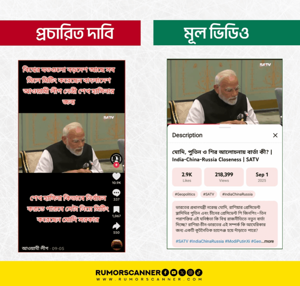 এ বিষয়ে অনুসন্ধানের শুরুতে ভিডিওটিতে দেশিয় মূলধারার সংবাদমাধ্যম ‘SATV’ এর লোগো দেখতে পাওয়া যায়। উক্ত তথ্যের সূত্র ধরে ‘SATV’ এর ইউটিউব চ্যানেলে গত ১ সেপ্টেম্বরে “মোদি, পুতিন ও শির আলোচনায় বার্তা কী? | India-China-Russia Closeness” শিরোনামে প্রচারিত একটি ভিডিও খুঁজে পাওয়া যায়। উক্ত ভিডিওর সঙ্গে আলোচিত দাবিতে প্রচারিত ভিডিওর দৃশ্যের মিল রয়েছে।