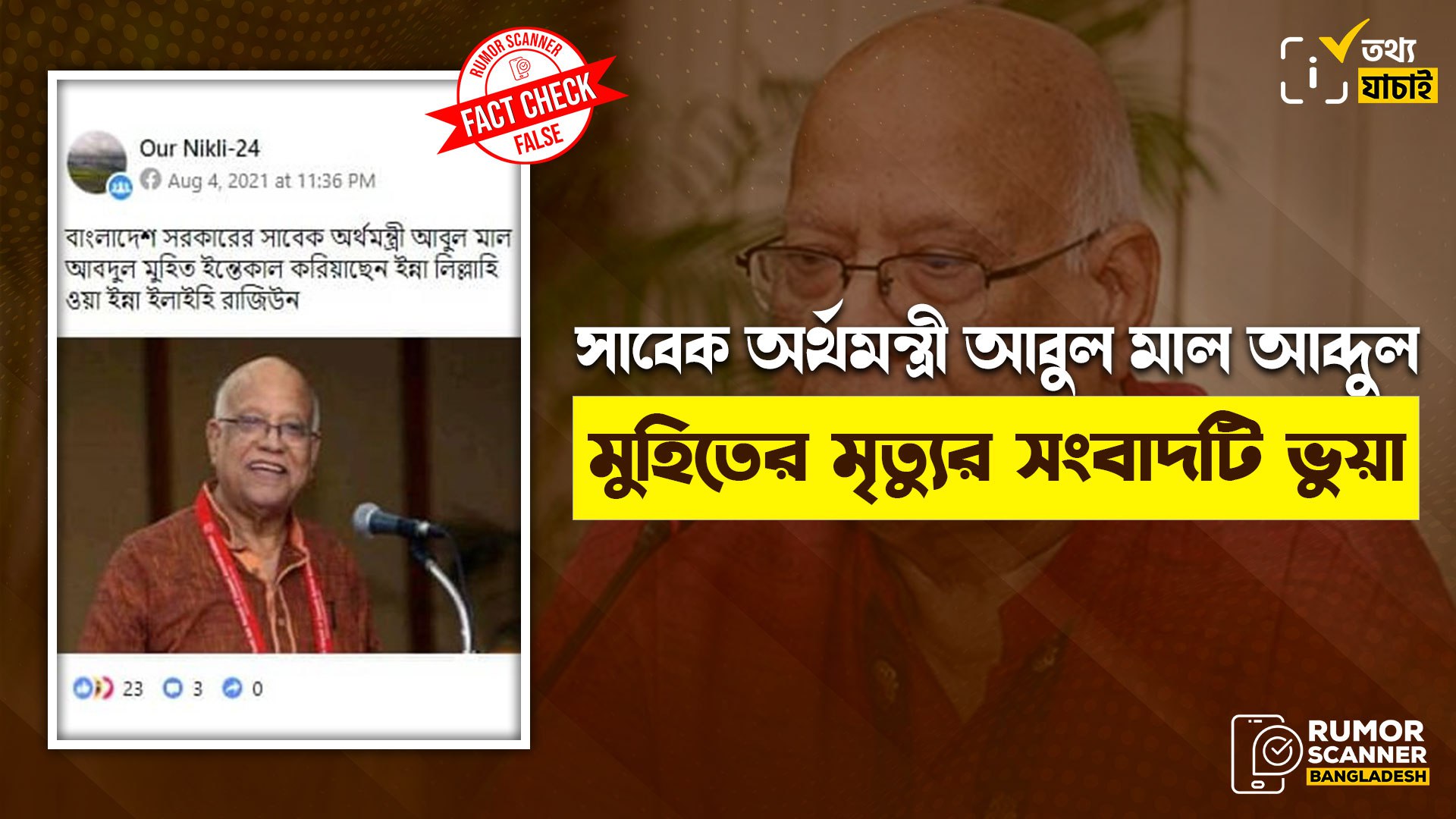 অর্থাৎ, সাবেক অর্থমন্ত্রী আবুল মাল আব্দুল মুহিতের মৃত্যুর সংবাদটি সম্পূর্ণ ভুয়া।