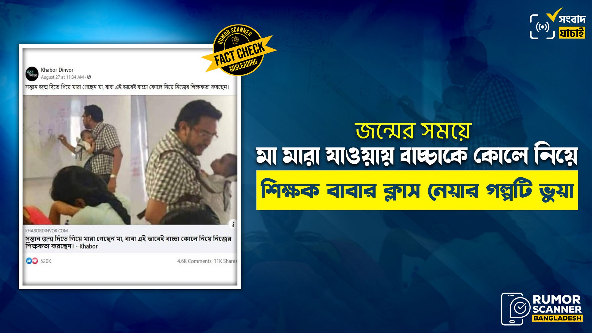 সম্প্রতি “সন্তান জন্ম দিতে গিয়ে মারা গেছেন মা, বাবা এই ভাবেই বাচ্চা কোলে নিয়ে নিজের শিক্ষকতা করছেন” শীর্ষক শিরোনামে একটি সংবাদ কিছু ভূইফোঁড় অনলাইন পোর্টালে প্রকাশের মাধ্যমে সামাজিক যোগাযোগ মাধ্যমগুলোতে ছড়িয়ে পড়েছে।