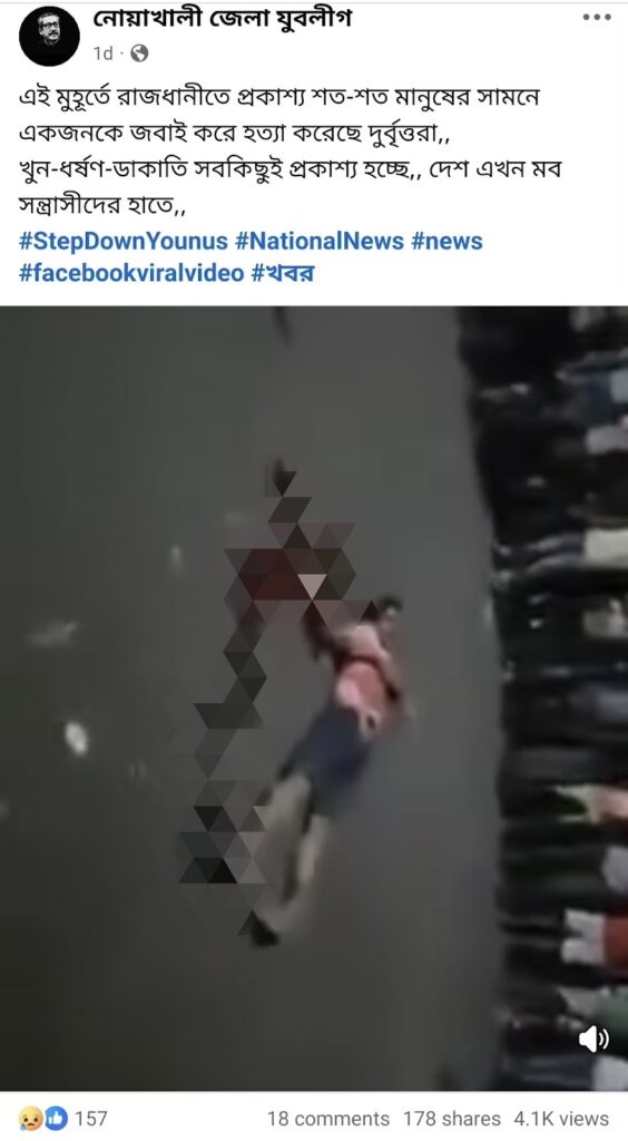 সম্প্রতি, ‘এই মুহূর্তে রাজধানীতে প্রকাশ্য শত-শত মানুষের সামনে একজনকে জবাই করে হত্যা করেছে দুর্বৃত্তরা’- শীর্ষক দাবিতে একটি ভিডিও সামাজিক যোগাযোগমাধ্যমে ছড়িয়ে পড়েছে।