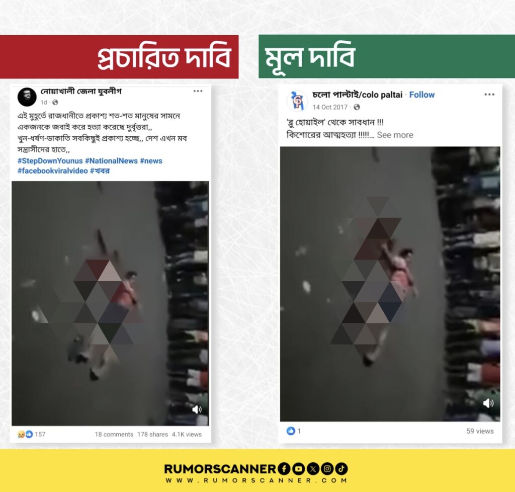 রিউমর স্ক্যানার টিমের অনুসন্ধানে জানা যায়, প্রচারিত ভিডিওটি সাম্প্রতিক সময়ের নয়। প্রকৃতপক্ষে, ২০১৭ সালে রাজধানীর সদরঘাটের শরিফ মার্কেট এলাকায় একটি ভবন থেকে পড়ে রাকিব নামে এক যুবকের মৃত্যুর ঘটনার দৃশ্য এটি।