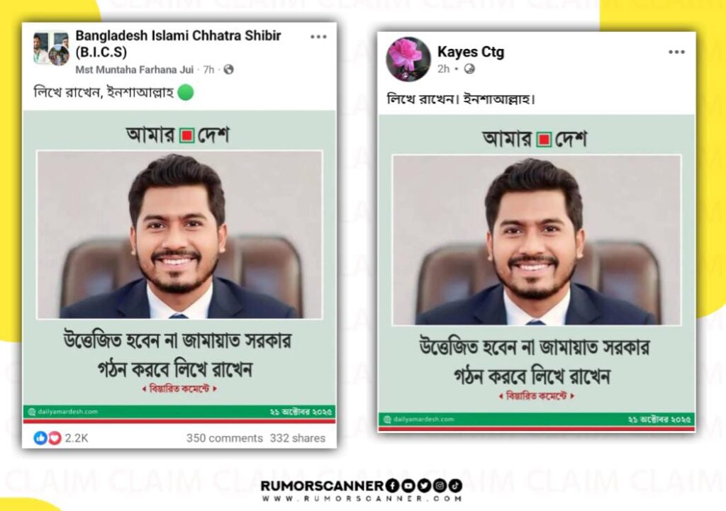 সম্প্রতি গণ অধিকার পরিষদের সভাপতি নুরুল হক নুরের ছবি সংযুক্ত করে ‘উত্তেজিত হবেন না জামায়াত সরকার গঠন করবে লিখে রাখেন’ ক্যাপশনে সংবাদমাধ্যম আমার দেশের ডিজাইন সম্বলিত একটি ফটোকার্ড সামাজিক যোগাযোগ মাধ্যমে প্রচার করা হয়েছে।