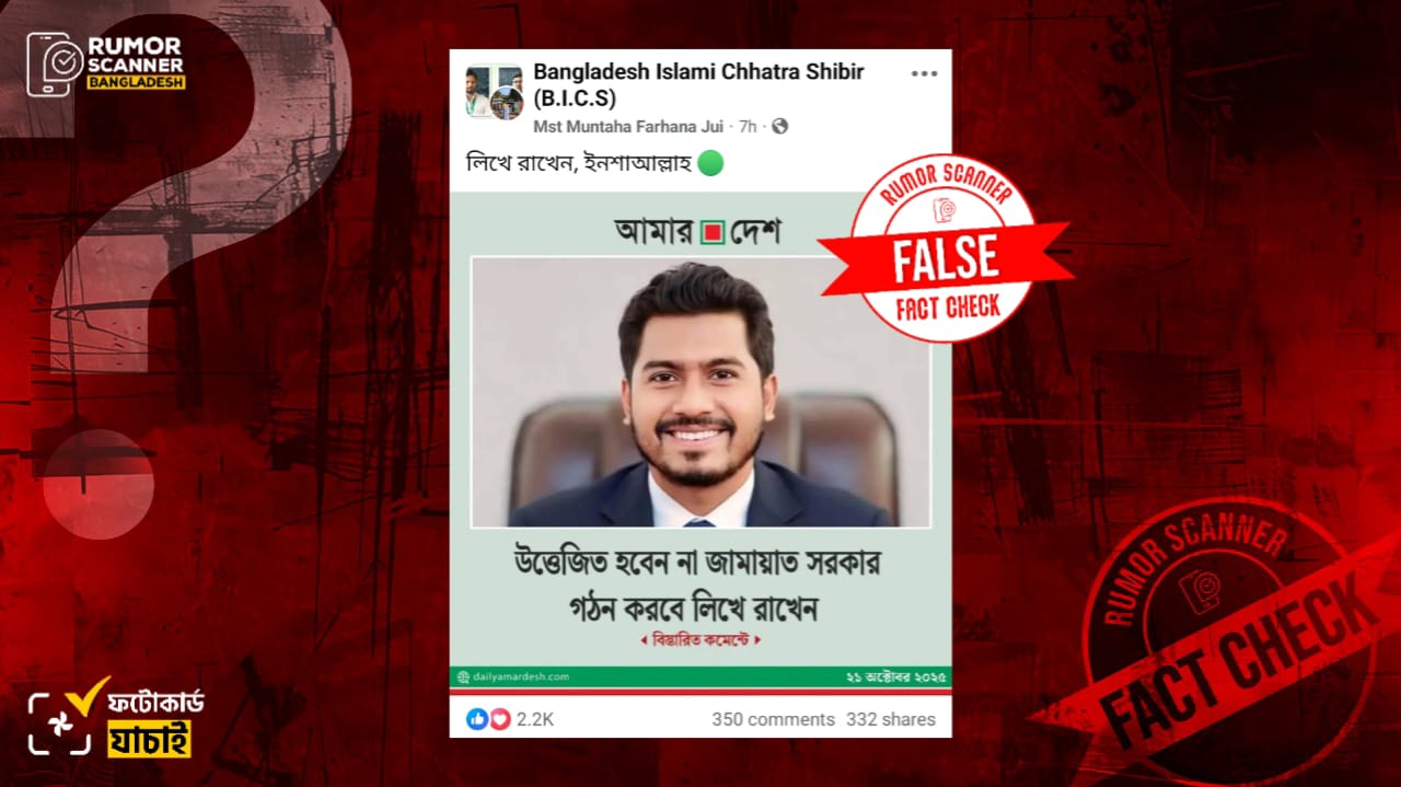 রিউমর স্ক্যানার টিমের অনুসন্ধানে জানা যায়, ‘উত্তেজিত হবেন না জামায়াত সরকার গঠন করবে লিখে রাখেন’ শীর্ষক মন্তব্য করেননি গণ অধিকার পরিষদের সভাপতি নুরুল হক নুর এবং আমার দেশও এমন কোনো ফটোকার্ড বা সংবাদ প্রকাশ করেনি। প্রকৃতপক্ষে, ডিজিটাল প্রযুক্তির সহায়তায় আমার দেশের ফটোকার্ড ডিজাইনের আদলে ফটোকার্ড তৈরি করে ভুয়া এই দাবিটি প্রচার করা হয়েছে।