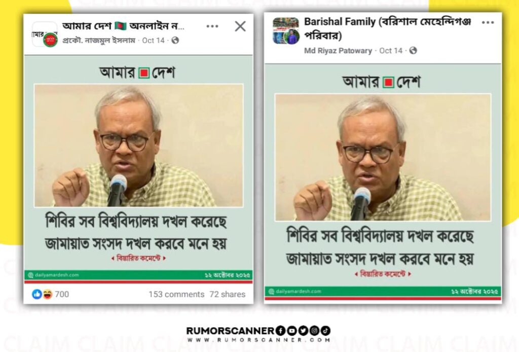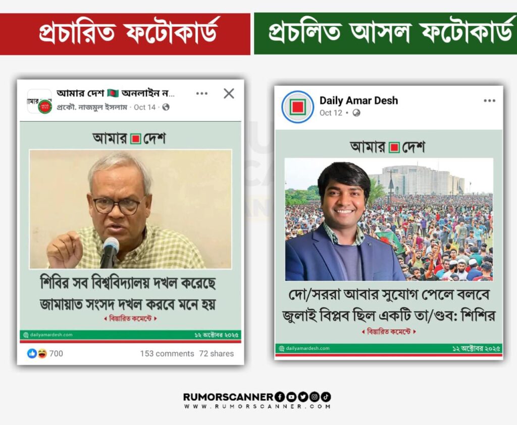 রিউমর স্ক্যানার টিমের অনুসন্ধানে জানা যায়, ‘শিবির সব বিশ্ববিদ্যালয় দখল করেছে জামায়াত সংসদ দখল করবে মনে হয়’ শীর্ষক মন্তব্য করেননি বিএনপির সিনিয়র যুগ্মসচিব রুহুল কবির রিজভী এবং আমার দেশও এমন কোনো ফটোকার্ড বা সংবাদ প্রকাশ করেনি। প্রকৃতপক্ষে, ডিজিটাল প্রযুক্তির সহায়তায় আমার দেশের ফটোকার্ড ডিজাইনের আদলে ফটোকার্ড তৈরি করে ভুয়া এই দাবিটি প্রচার করা হয়েছে।