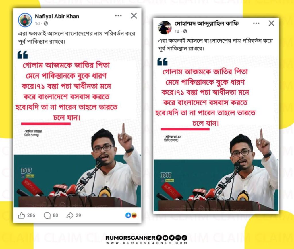সম্প্রতি সামাজিক যোগাযোগ মাধ্যমে ডাকসু ভিপি সাদিক কায়েমের ছবিযুক্ত একটি ফটোকার্ড প্রচার করা হয়। যেখানে দাবি করা হয় যে তিনি বলেছেন- ‘গোলাম আজমকে জাতির পিতা মেনে পাকিস্তানকে বুকে ধারণ করে। ৭১ বস্তা পচা স্বাধীনতা মনে করে বাংলাদেশে বসবাস করতে হবে। যদি তা না পারেন তাহলে ভারতে চলে যান।’ এরূপ দাবি প্রচার করে ক্যাপশনে লেখা হয়েছে, ‘এরা ক্ষমতাই আসলে বাংলাদেশের নাম পরিবর্তন করে পূর্ব পাকিস্তান রাখবে’।