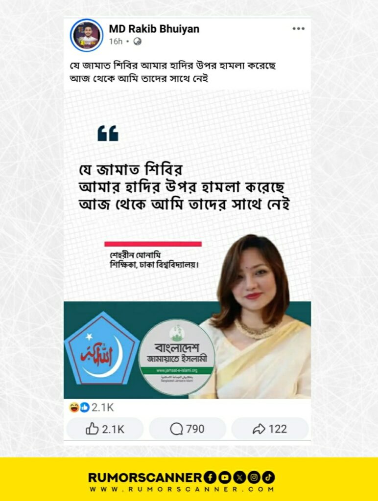 সম্প্রতি, ঢাকা বিশ্ববিদ্যালয়ের সহকারী অধ্যাপক ও বিশ্ববিদ্যালয়টির সহকারী প্রক্টর শেহরীন আমিন ভূঁইয়া (মোনামী)-এর বক্তব্য ও ছবিযুক্ত একটি ফটোকার্ড সামাজিক যোগাযোগ মাধ্যমে প্রচার করা হয়। যেখানে দাবি করা হয় যে তিনি বলেছেন, যে জামায়াত শিবির আমার হাদির উপর হামলা করেছে আজ থেকে আমি তাদের সাথে নেই।