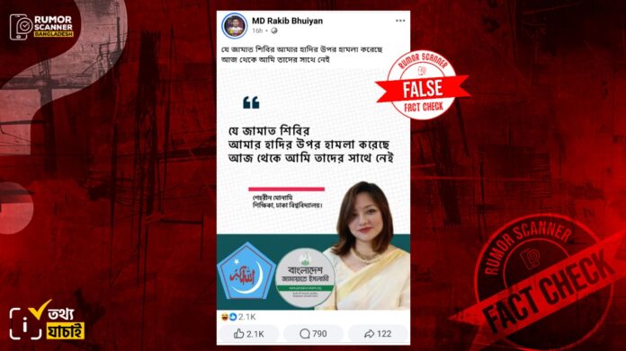 রিউমর স্ক্যানার টিমের অনুসন্ধানে জানা যায়, শেহরীন আমিন ভূঁইয়া (মোনামী) হাদিকে হামলার ঘটনায় জামায়াত-শিবিরকে দোষী বানিয়ে এমন কোনো মন্তব্য করেননি। প্রকৃতপক্ষে, কোনো তথ্য প্রমাণ ছাড়াই ভুয়া বক্তব্যটি প্রচার করা হয়েছে।