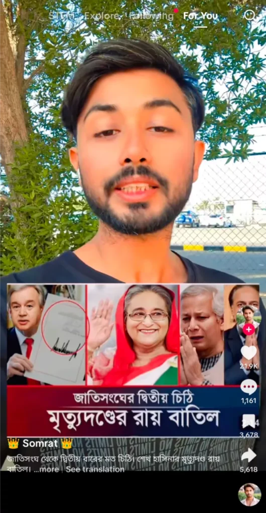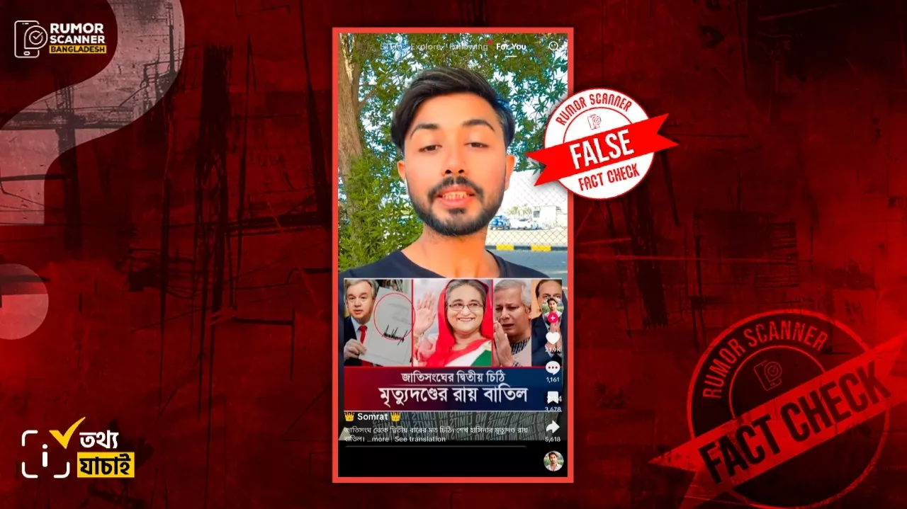 জুলাই গণঅভ্যুত্থানের সময় সংঘটিত মানবতাবিরোধী অপরাধের মামলায় ক্ষমতাচ্যুত প্রধানমন্ত্রী শেখ হাসিনাকে গত ১৭ নভেম্বর মৃত্যুদণ্ডের রায় দেয় আন্তর্জাতিক অপরাধ ট্রাইব্যুনাল। এর প্রেক্ষিতে শেখ হাসিনার মৃত্যুদণ্ডের রায় বাতিল করার জন্যে জাতিসংঘের মহাসচিব আন্তোনিও গুতেরেস বাংলাদেশের রাষ্ট্রপতি মোহাম্মদ সাহাবুদ্দিনকে একটি নির্দেশনামূলক চিঠি দিয়েছিলেন দাবিতে সামাজিক যোগাযোগ মাধ্যমে একটি তথ্য প্রচার করা হয়েছিল। সম্প্রতি, শেখ হাসিনার মৃত্যুদণ্ডের রায় বাতিলের জন্যে জাতিসংঘ থেকে দ্বিতীয় বারের মত আরেকটি চিঠি দেওয়া হয়েছে দাবিতে টিকটকে একটি ভিডিও প্রচার করা হয়েছে। প্রচারিত ভিডিওটিতে দাবি করা হয়, উক্ত চিঠির প্রক্ষিতে শেখ হাসিনার মৃত্যুদণ্ডের রায় বাতিল করা হয়েছে।
