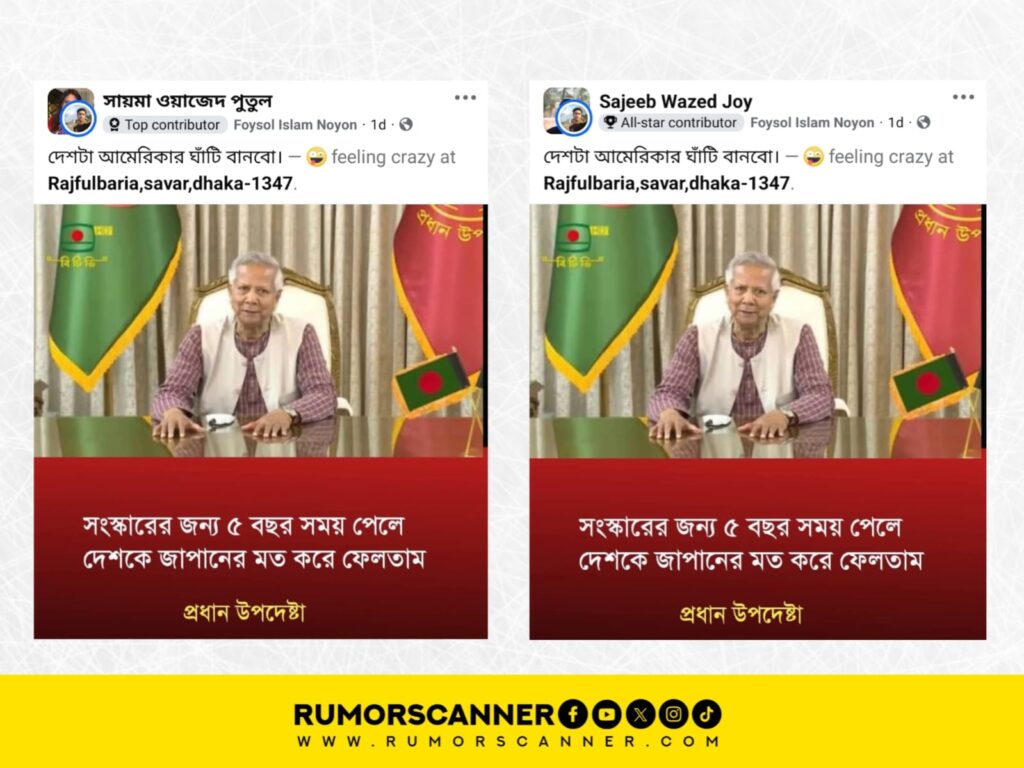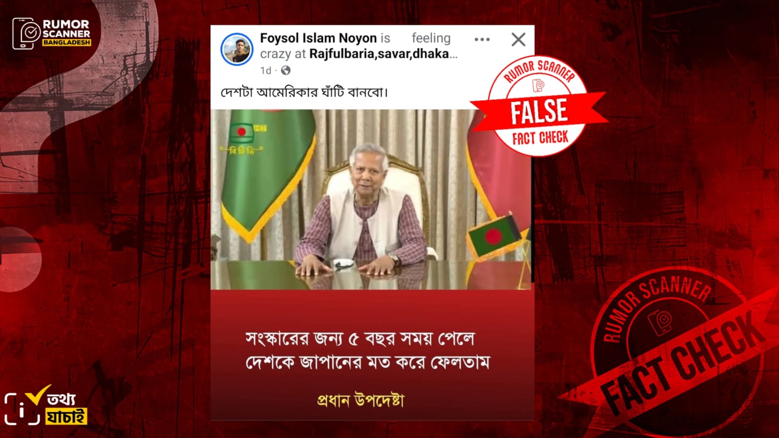 রিউমর স্ক্যানার টিমের অনুসন্ধানে জানা যায়, সংস্কারের জন্য পাঁচ বছর সময় পেলে দেশকে জাপানের মতো করে ফেলতেন বলে মন্তব্য করেননি ড. মুহাম্মদ ইউনূস। প্রকৃতপক্ষে, কোনো তথ্য প্রমাণ ছাড়াই ড. ইউনূসকে উদ্ধৃত করে আলোচিত দাবিটি প্রচার করা হয়েছে।