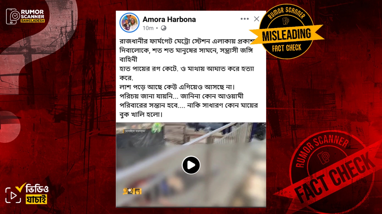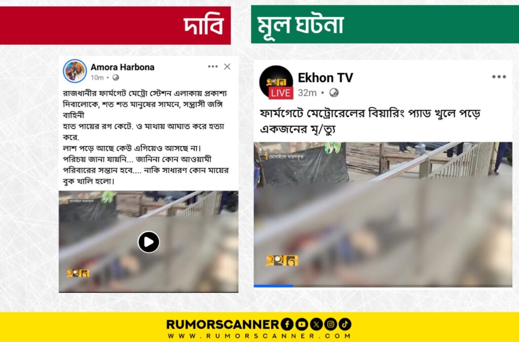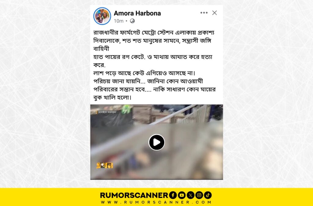 অতি সম্প্রতি, “রাজধানীর ফার্মগেট মেট্রো স্টেশন এলাকায় প্রকাশ্য দিবালোকে, শত শত মানুষের সামনে, সন্ত্রাসী জঙ্গি বাহিনী হাত পায়ের রগ কেটে. ও মাথায় আঘাত করে হত্যা করে. লাশ পড়ে আছে কেউ এগিয়েও আসছে না। পরিচয় জানা যায়নি… জানিনা কোন আওয়ামী পরিবারের সন্তান হবে…. নাকি সাধারণ কোন মায়ের বুক খালি হলো।” শীর্ষক ক্যাপশনে একটি ভিডিও সামাজিক যোগাযোগ মাধ্যমে প্রচার করা হয়েছে।