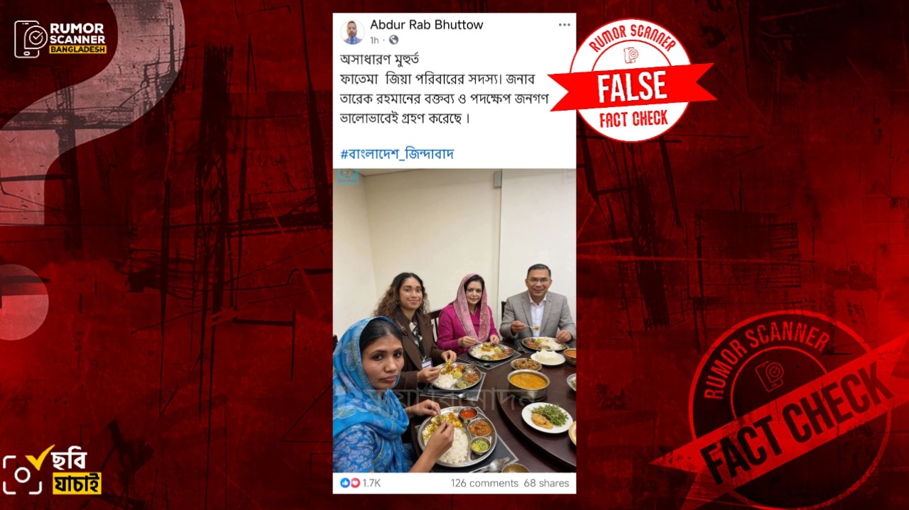 রিউমর স্ক্যানার টিমের অনুসন্ধানে জানা যায়, তারেক রহমানের পরিবারের সাথে এক টেবিলে ফাতেমার খাবার খাওয়ার এই ছবিটি আসল নয়। প্রকৃতপক্ষে, এআই দিয়ে তৈরি এই ভুয়া ছবিটি ’12মায়া বিনোদন’ নামের একটি ফেসবুক পেজ থেকে ০২ জানুয়ারি দুপুরে প্রথম প্রকাশ করা হয়। মূল ছবিটির এক কোণে এআই দিয়ে তৈরি লেখা থাকলেও এই লেখা কেটে এমনকি লেখা থাকার পরও তা বাস্তব দাবিতেই প্রচার করছেন অনেকে।