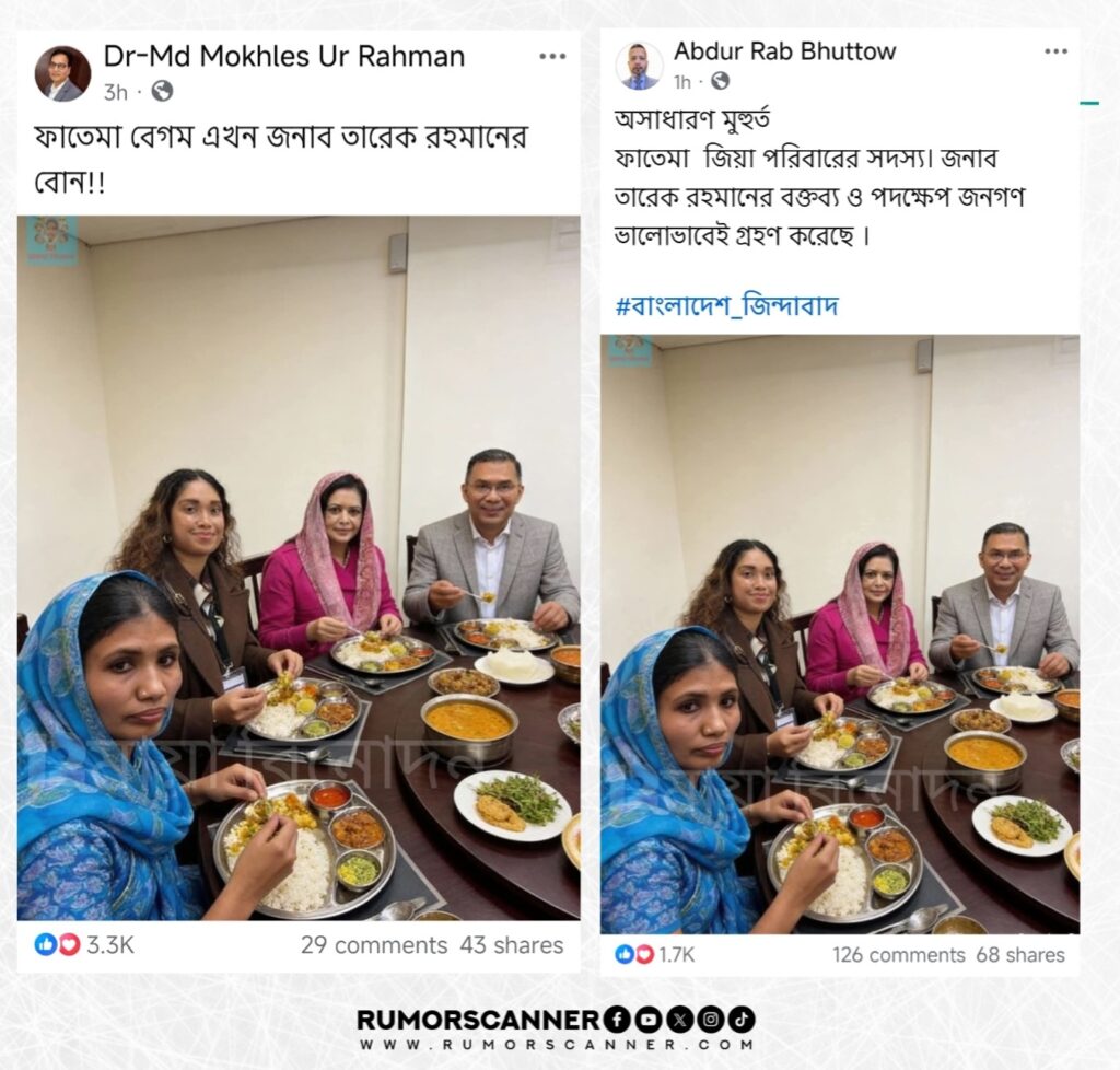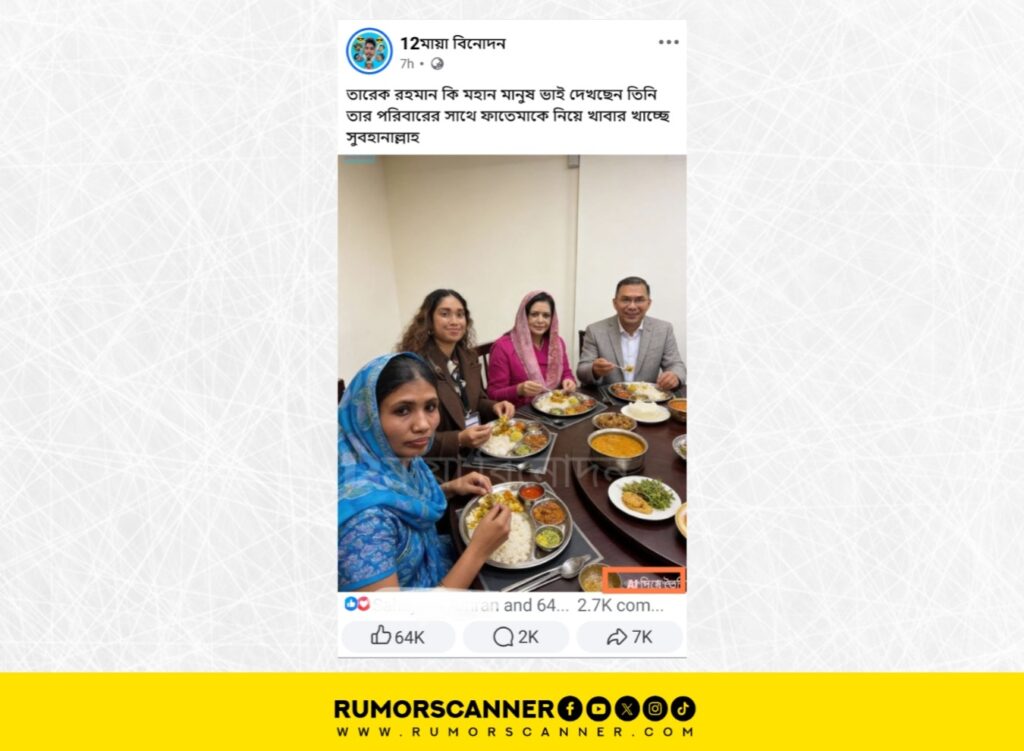 খালেদা জিয়ার গৃহপরিচারিকা ফাতেমাকে নিয়ে অনলাইনে বেশ আলোচনা দেখা যাচ্ছে। এসব আলোচনায় এই ছবিটিও ব্যবহার হচ্ছে, যাতে দেখা যাচ্ছে, তারেক রহমানের পরিবারের সাথে এক টেবিলে বসে খাবার খাচ্ছেন ফাতেমা।