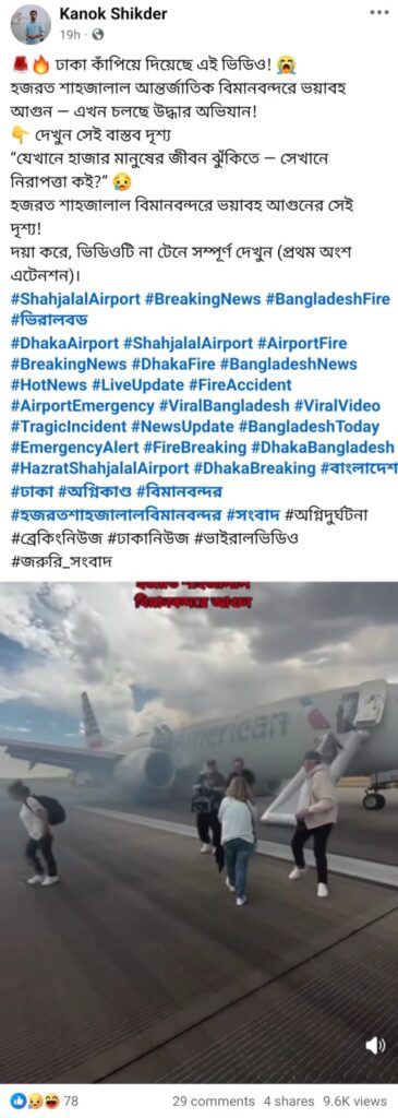 গত ১৮ অক্টোবর ঢাকার হজরত শাহজালাল আন্তর্জাতিক বিমানবন্দরের কার্গো ভিলেজ কমপ্লেক্স ভবনে ভয়াবহ অগ্নিকাণ্ডের ঘটনা ঘটে। ১৩টি ফায়ার স্টেশনের ৩৭টি ইউনিটের প্রায় সাড়ে ছয় ঘণ্টার চেষ্টায় আগুন নিয়ন্ত্রণে আনা হয়। এরই প্রেক্ষিতে, ‘ঢাকা কাঁপিয়ে দিয়েছে এই ভিডিও! হজরত শাহজালাল আন্তর্জাতিক বিমানবন্দরে ভয়াবহ আগুন — এখন চলছে উদ্ধার অভিযান! দেখুন সেই বাস্তব দৃশ্য “যেখানে হাজার মানুষের জীবন ঝুঁকিতে — সেখানে নিরাপত্তা কই?” হজরত শাহজালাল বিমানবন্দরে ভয়াবহ আগুনের সেই দৃশ্য!’ দাবিতে একটি ভিডিও সামাজিক যোগাযোগ মাধ্যমে প্রচার করা হয়েছে।