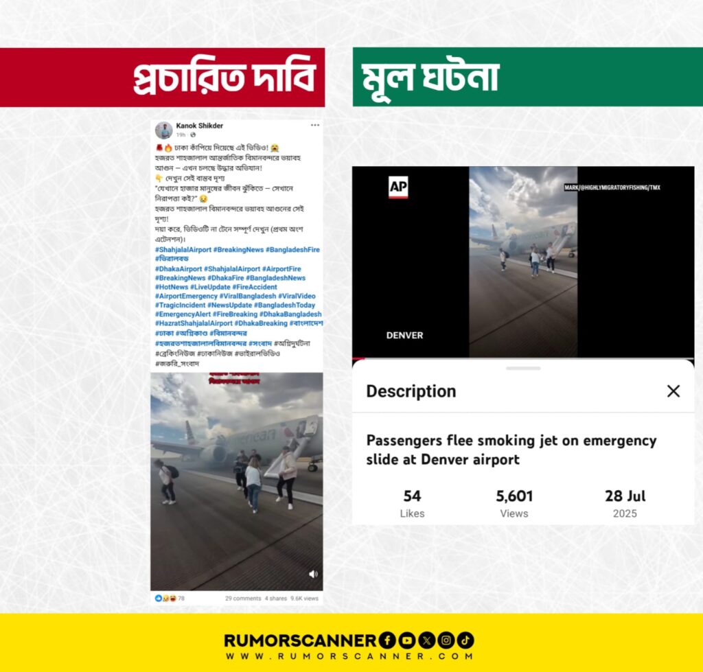 এ বিষয়ে অনুসন্ধানে আন্তর্জাতিক গণমাধ্যম ‘Associated Press’ এর ইউটিউব চ্যানেলে গত ২৮ জুলাই ‘Passengers flee smoking jet on emergency slide at Denver airport’ শিরোনামে প্রচারিত একটি ভিডিও খুঁজে পাওয়া যায়। উক্ত ভিডিওর সাথে আলোচিত দাবিতে প্রচারিত ভিডিওর প্রথম অংশের মিল রয়েছে।