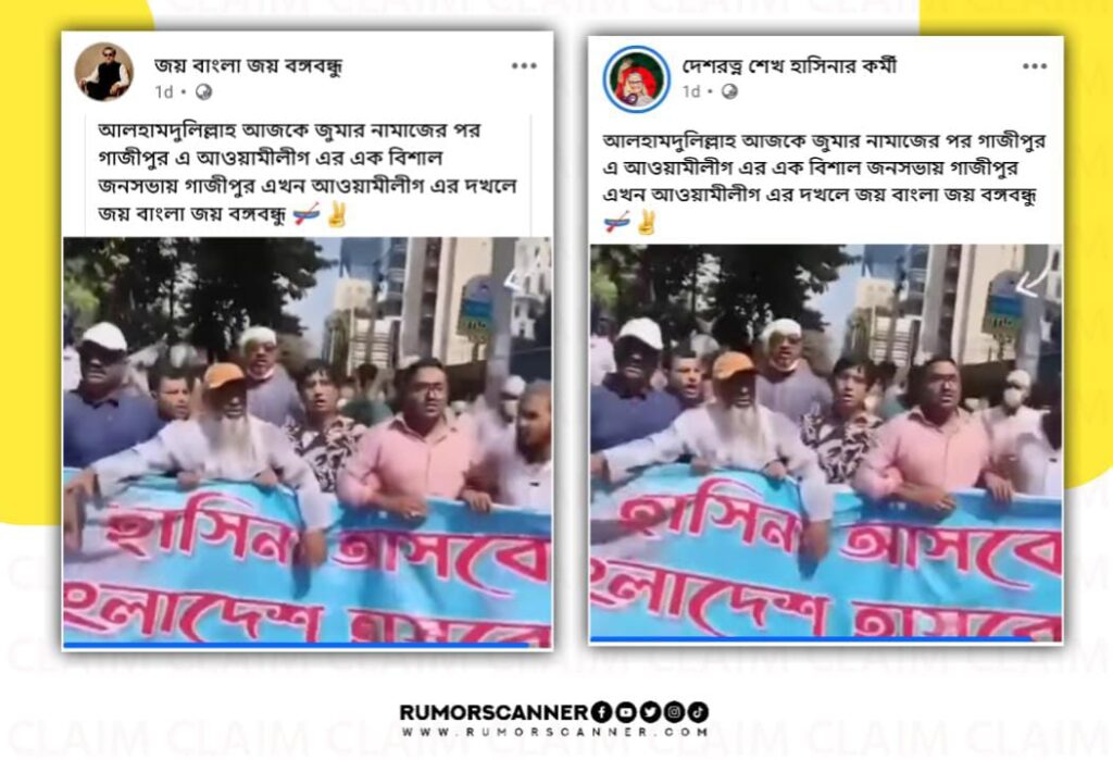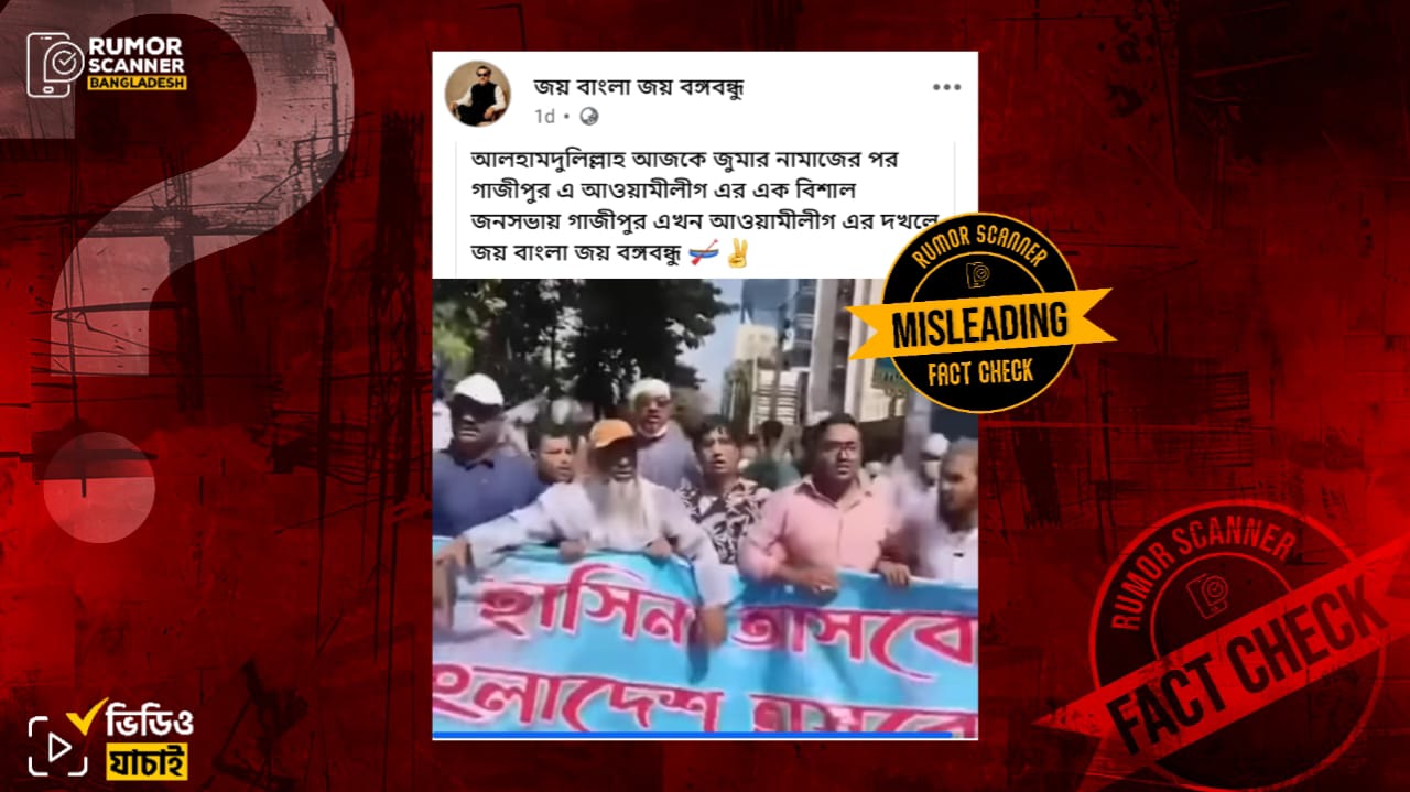 গত ২৪ অক্টোবর (শুক্রবার) সামাজিক যোগাযোগ মাধ্যমে মিছিলের একটি ভিডিও প্রচার করে দাবি করা হয়েছে, ‘আলহামদুলিল্লাহ আজকে জুমার নামাজের পর গাজীপুর এ আওয়ামীলীগ এর এক বিশাল জনসভায় গাজীপুর এখন আওয়ামীলীগ এর দখলে জয় বাংলা জয় বঙ্গবন্ধু’।