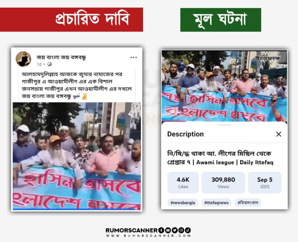রিউমর স্ক্যানার টিমের অনুসন্ধানে দেখা যায়, আওয়ামী লীগের আলোচিত মিছিলের ভিডিওটি গত ২৪ অক্টোবরের বা গাজীপুরের নয়। বরং, গত ৫ সেপ্টেম্বর রাজধানীর তেজগাঁওয়ের নাবিস্কো এলাকায় ঢাকা মহানগর উত্তর আওয়ামী লীগের ব্যানারে হওয়া মিছিলের ভিডিওকে আলোচিত দাবিতে প্রচার করা হয়েছে।