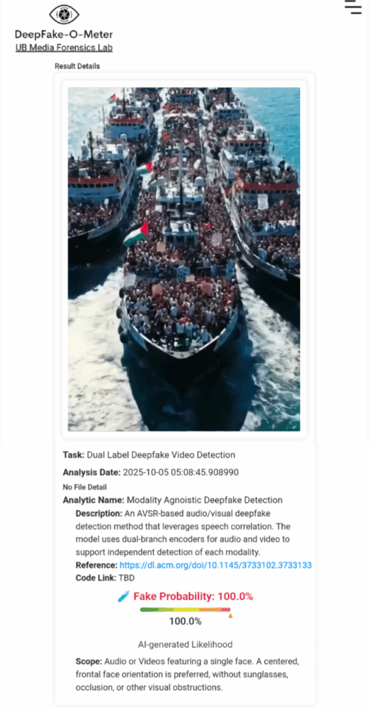 সুতরাং, গ্লোবাল সুমুদ ফ্লোটিলা নৌবহরের ভিডিও দাবিতে এআই দিয়ে তৈরি ভিডিও প্রচার করা হয়েছে; যা সম্পূর্ণ মিথ্যা।
