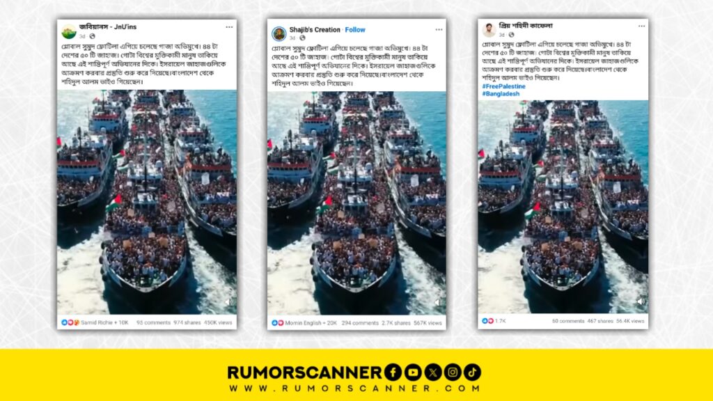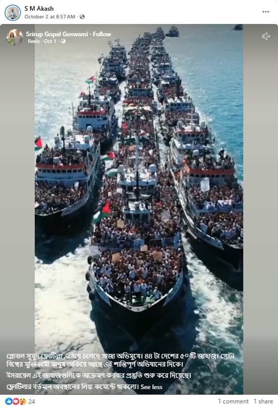 গাজায় চলমান ইসরায়েলের অবৈধ অবরোধের প্রতিবাদে গত ৩১ আগস্ট স্পেনের বার্সেলোনা থেকে যাত্রা শুরু করে আন্তর্জাতিক মানবাধিকার কর্মীদের ত্রাণ নিয়ে যাওয়ার নৌ উদ্যোগ গ্লোবাল সুমুদ ফ্লোটিলা। পরবর্তীতে ১৩ থেকে ১৫ সেপ্টেম্বর তিউনিসিয়া, ইতালির সিসিলি দ্বীপ ও গ্রিসের সাইরাস দ্বীপ থেকে আরও কিছু নৌযান ত্রাণ নিয়ে বহরে যুক্ত হয়। এর প্রেক্ষিতে সম্প্রতি, উক্ত নৌবহরের ভিডিও দাবিতে সামাজিক যোগাযোগ মাধ্যম ফেসবুকে একটি ভিডিও প্রচার করা হয়েছে।