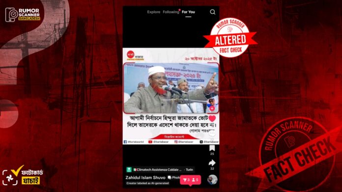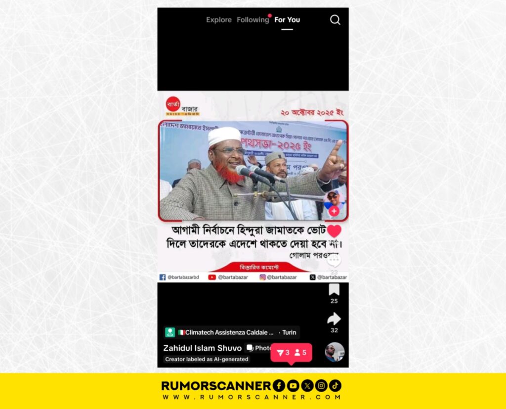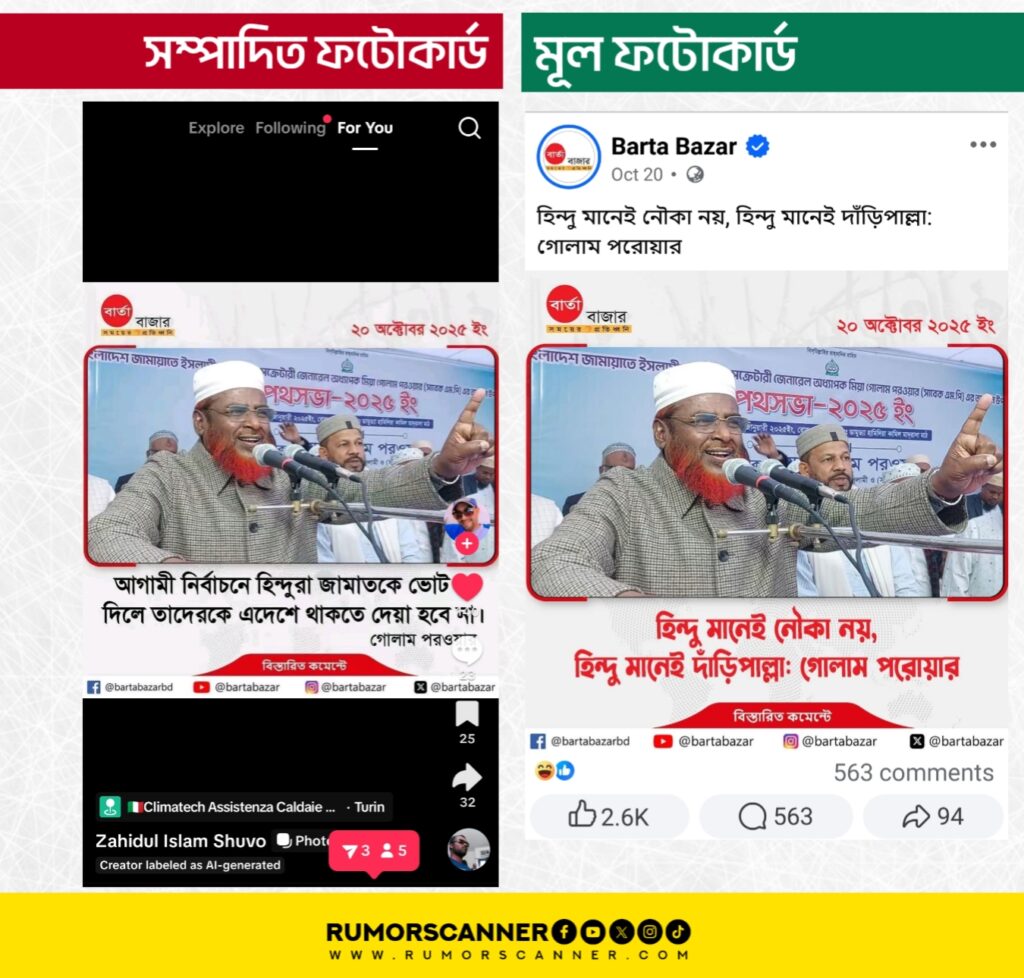 মূল ফটোকার্ড সংবলিত পোস্টটির কমেন্টে পাওয়া সংবাদ প্রতিবেদন থেকে জানা যায়, বাংলাদেশ জামায়াতে ইসলামীর সেক্রেটারি অধ্যাপক মিয়া গোলাম পরোয়ার বলেছেন, ‘একটি ভুল ধারণা আছে হিন্দু মানেই আওয়ামী লীগ ও নৌকা। এবার হিন্দুরা দেখিয়ে দেবে, হিন্দু মানেই নৌকা নয়, হিন্দু মানেই দাঁড়িপাল্লা। তালা ও কলারোয়ার হিন্দুরা যদি দাঁড়িপাল্লায় ভোট দেন, তাহলে তারা অতীতের শাসন থেকে নিরাপদে থাকবেন, ইনশাআল্লাহ।’ ২০ অক্টোবর সাতক্ষীরার তালায় অনুষ্ঠিত ছাত্র-যুব সমাবেশে তিনি এসব কথা বলেন।