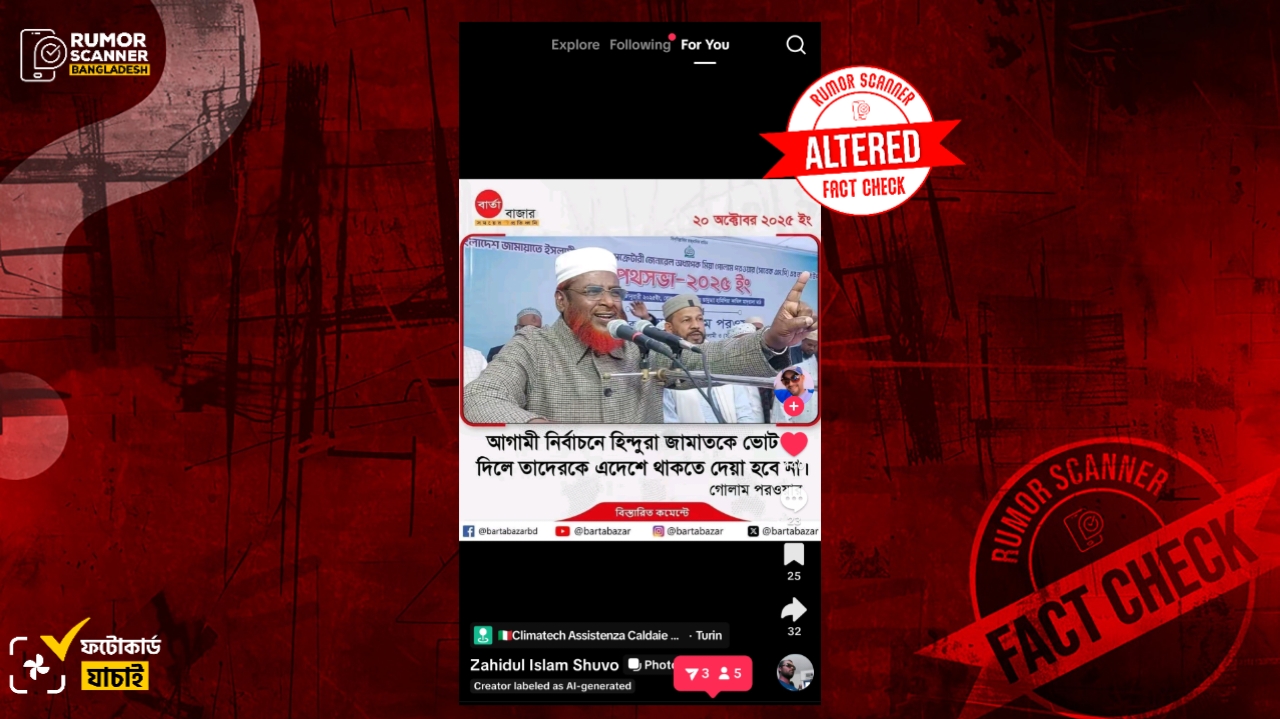 রিউমর স্ক্যানার টিমের অনুসন্ধানে দেখা যায়, বাংলাদেশ জামায়াতে ইসলামীর সেক্রেটারি অধ্যাপক মিয়া গোলাম পরওয়ার এমন কোনো মন্তব্য করেননি এবং উক্ত শিরোনামে বার্তা বাজারও কোনো ফটোকার্ড প্রকাশ করেনি। প্রকৃতপক্ষে, মিয়া গোলাম পরওয়ারকে নিয়ে প্রকাশিত বার্তা বাজারের ভিন্ন ফটোকার্ড ডিজিটাল প্রযুক্তির সহায়তার সম্পাদনার মাধ্যমে আলোচিত ফটোকার্ডটি তৈরি করা হয়েছে।