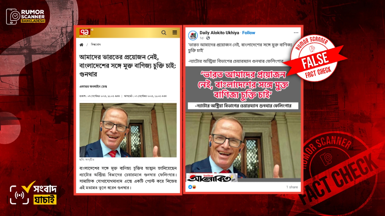 রিউমর স্ক্যানার টিমের অনুসন্ধানে দেখা যায়, ‘আমাদের ভারতের প্রয়োজন নেই, বাংলাদেশের সঙ্গে মুক্ত বাণিজ্য চুক্তি চাই’ শীর্ষক মন্তব্যকারী গুনথার ফেলিংগার ন্যাটোর কোনো কর্মকর্তা নয়। এছাড়াও অস্ট্রিয়া ন্যাটোর সদস্য রাষ্ট্রও নয়। পাশাপাশি ‘ন্যাটোর অস্ট্রিয়া বিভাগ’ নামে কোনো প্রাতিষ্ঠানিক সংস্থা বা দফতর নেই। প্রকৃতপক্ষে, ফেলিংগার ন্যাটো সম্প্রসারণের পক্ষে সক্রিয় একজন অ্যাক্টিভিস্ট। তিনি নিজেকে ‘অস্ট্রিয়ান কমিটি ফর ন্যাটো এনলার্জমেন্ট’-এর চেয়ারম্যান পরিচয় দিলেও এটি তার ব্যক্তিগতভাবে পরিচালিত একটি প্রতিষ্ঠান।
