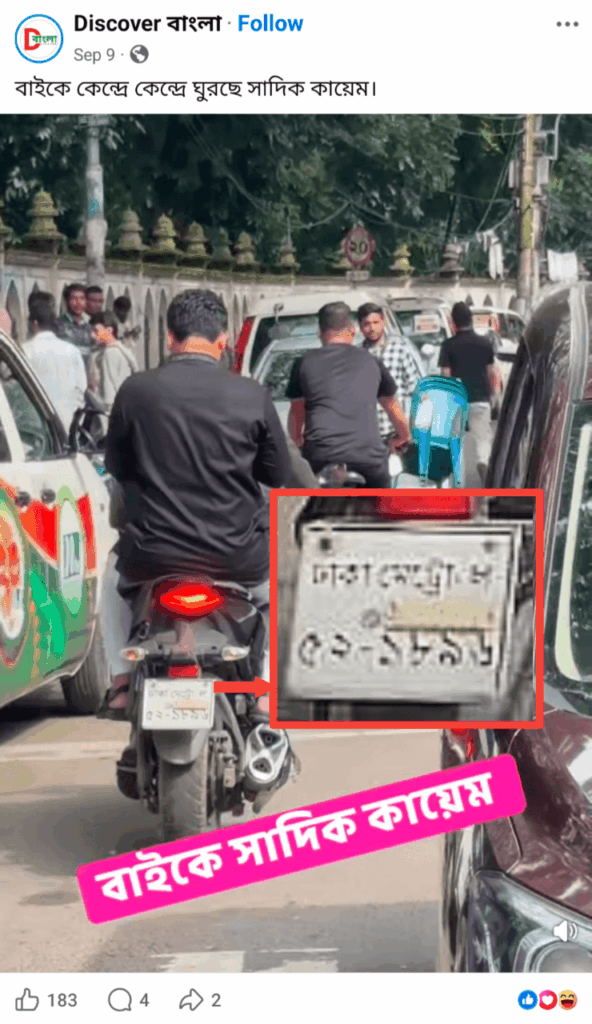 পরবর্তীতে অনুসন্ধানে জানা যায়, হাদিও ওপর হামলার ঘটনায় ব্যবহৃত মোটরসাইকেলের রেজিস্ট্রেশন নাম্বার ‘ঢাকা মেট্রো-ল ৫৪-৬৩৭৫’। পাশাপাশি সাদিক কায়েমকে বহনকারী মোটরসাইকেলের আরেকটি ভিডিও খুঁজে পাওয়া যায়। ভিডিওটিতে উক্ত মোটরসাইকেলের রেজিস্ট্রেশন নাম্বার দেখতে পাওয়া যায় ‘ঢাকা মেট্রো-ল ৫২-১৮৯৬’।